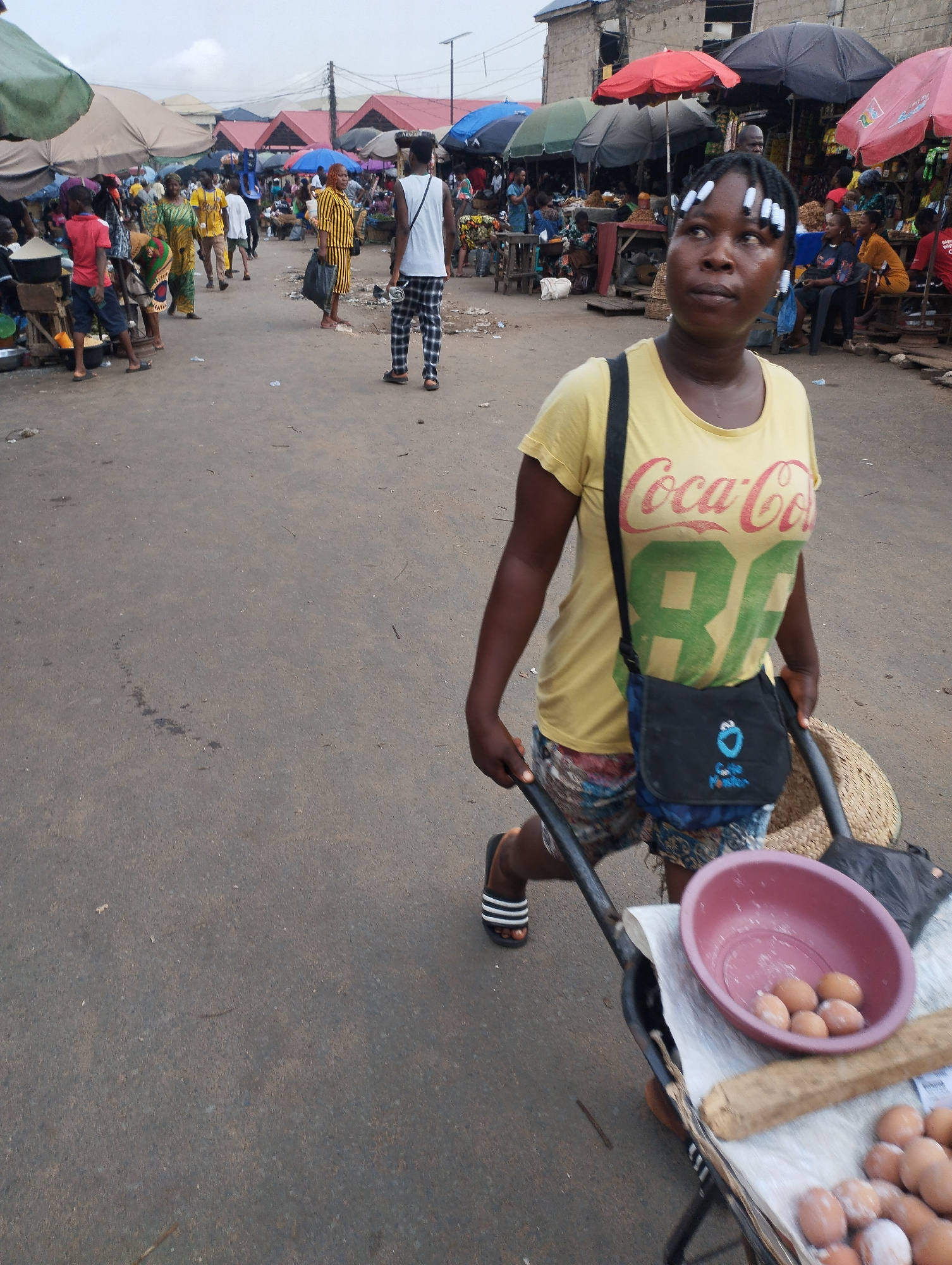 The image shows a woman pulling a cart of eggs at a market in Fegge, Nigeria. She wears a yellow t-shirt and has white beads in her hair. She is looking to the right. The cart also contains a yam. Peo…read more