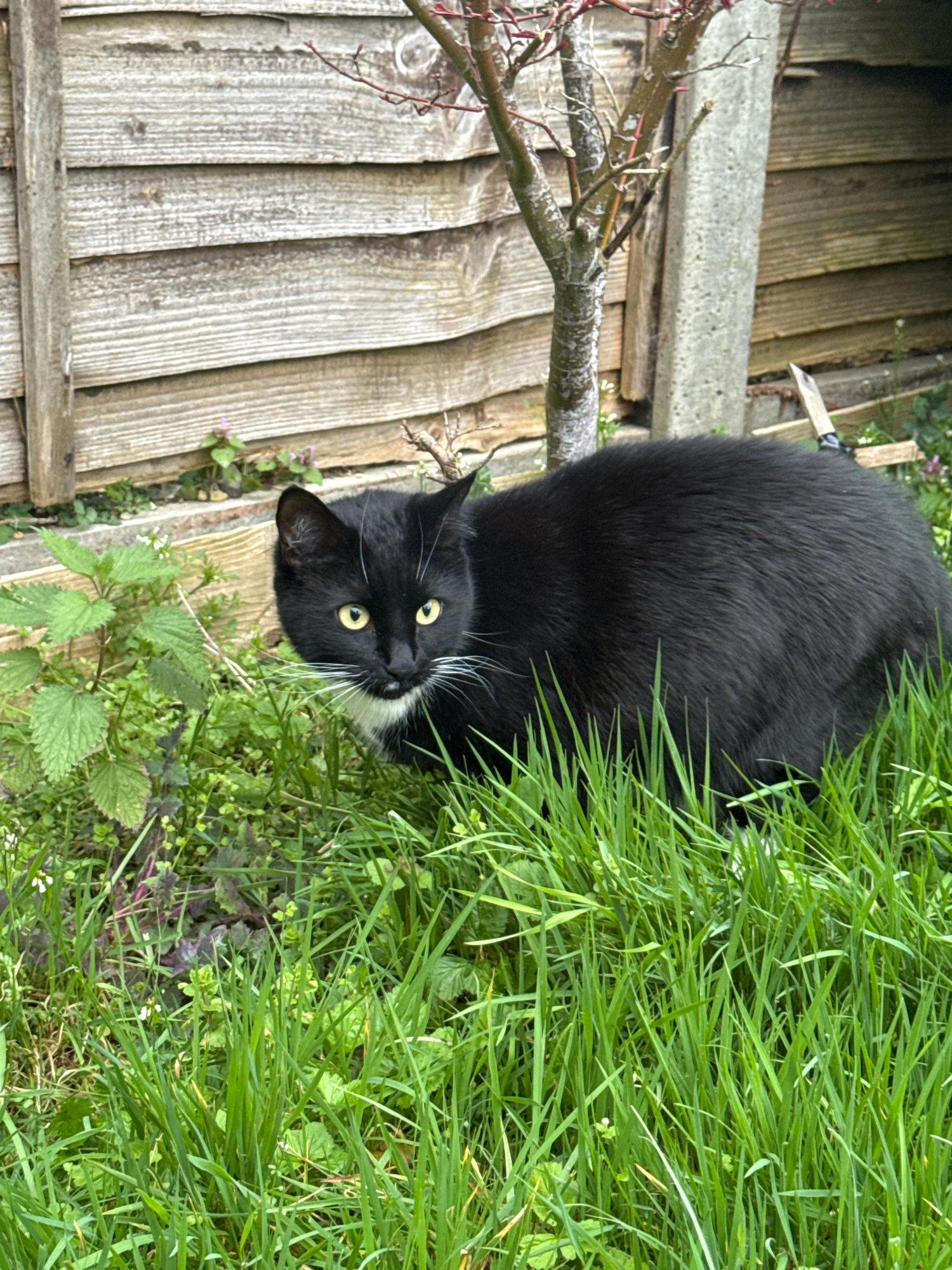 A black and white tuxedo cat with yellow eyes sits amidst tall green grass in Desborough, United Kingdom. The cat is partially obscured by the grass. A weathered wooden fence and bare branches are vis…read more