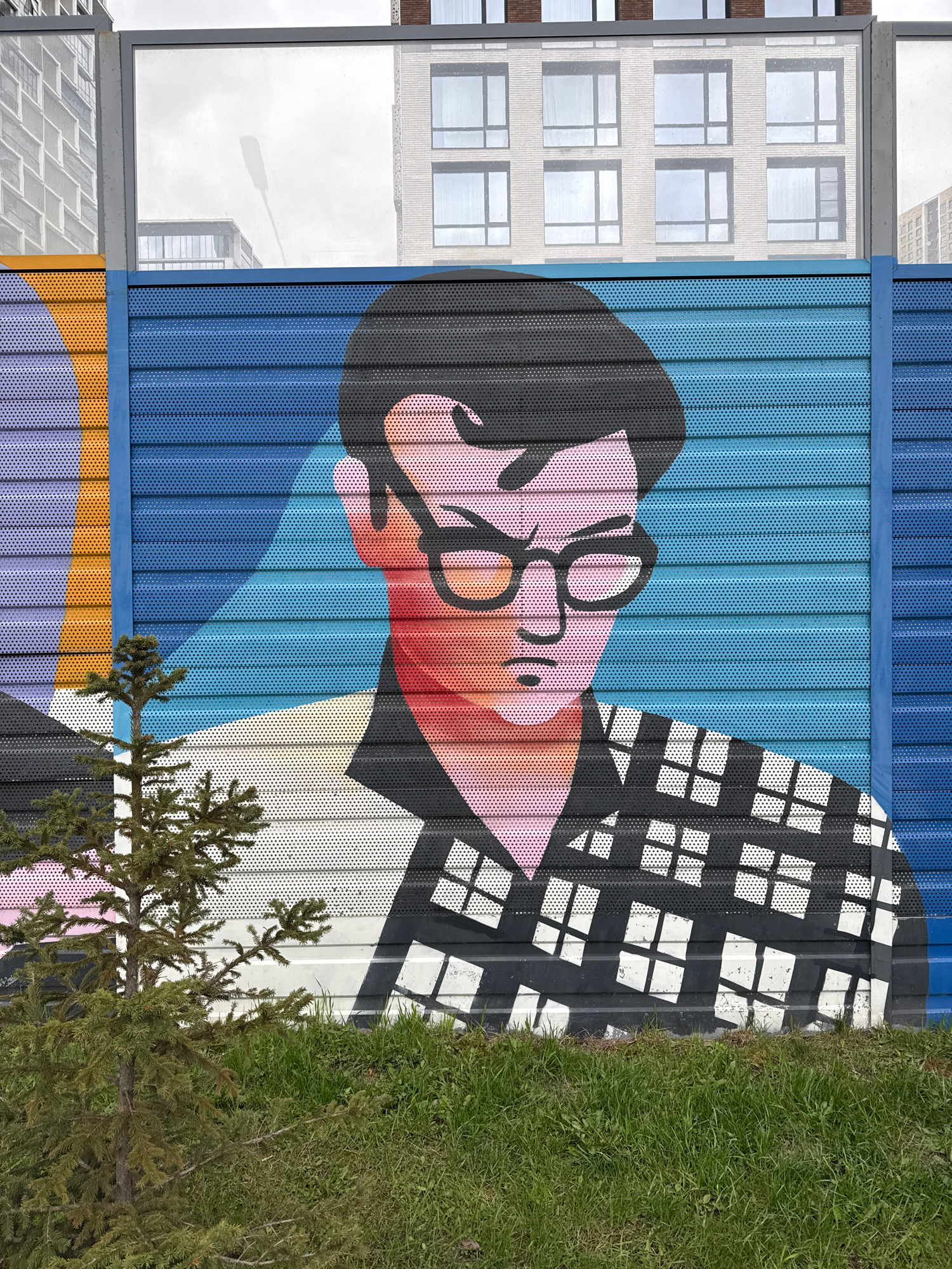 The image is an outdoor shot of an architectural detail. A building facade features a section with a mural depicting a person wearing glasses, rendered in a geometric style. The mural uses shades of b…read more