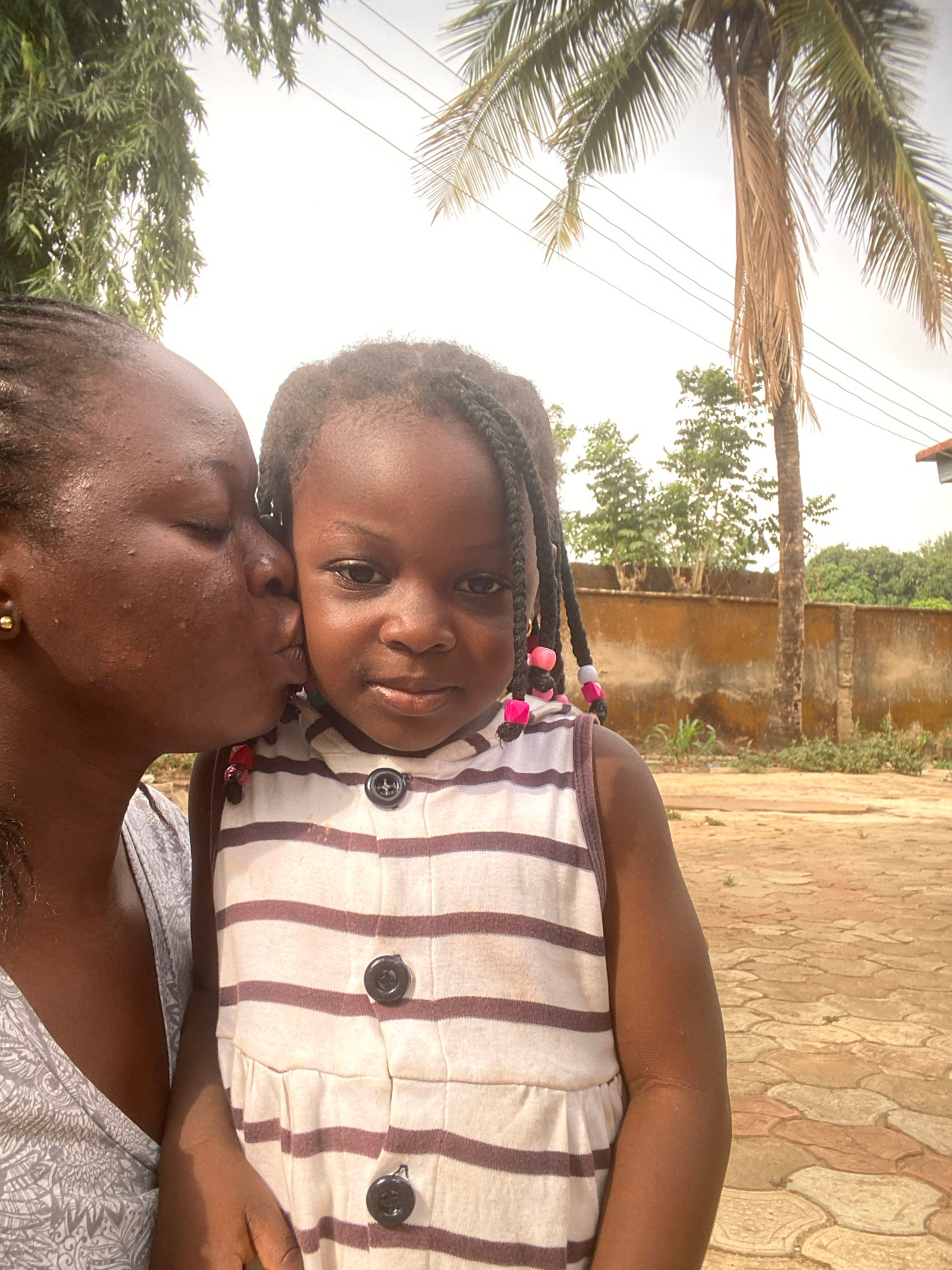 In Maigizo, Nigeria, a woman is kissing a child on the forehead. The child is wearing a striped shirt and has braids with colorful beads. They are outdoors with trees and a wall in the background. Theβ¦read more