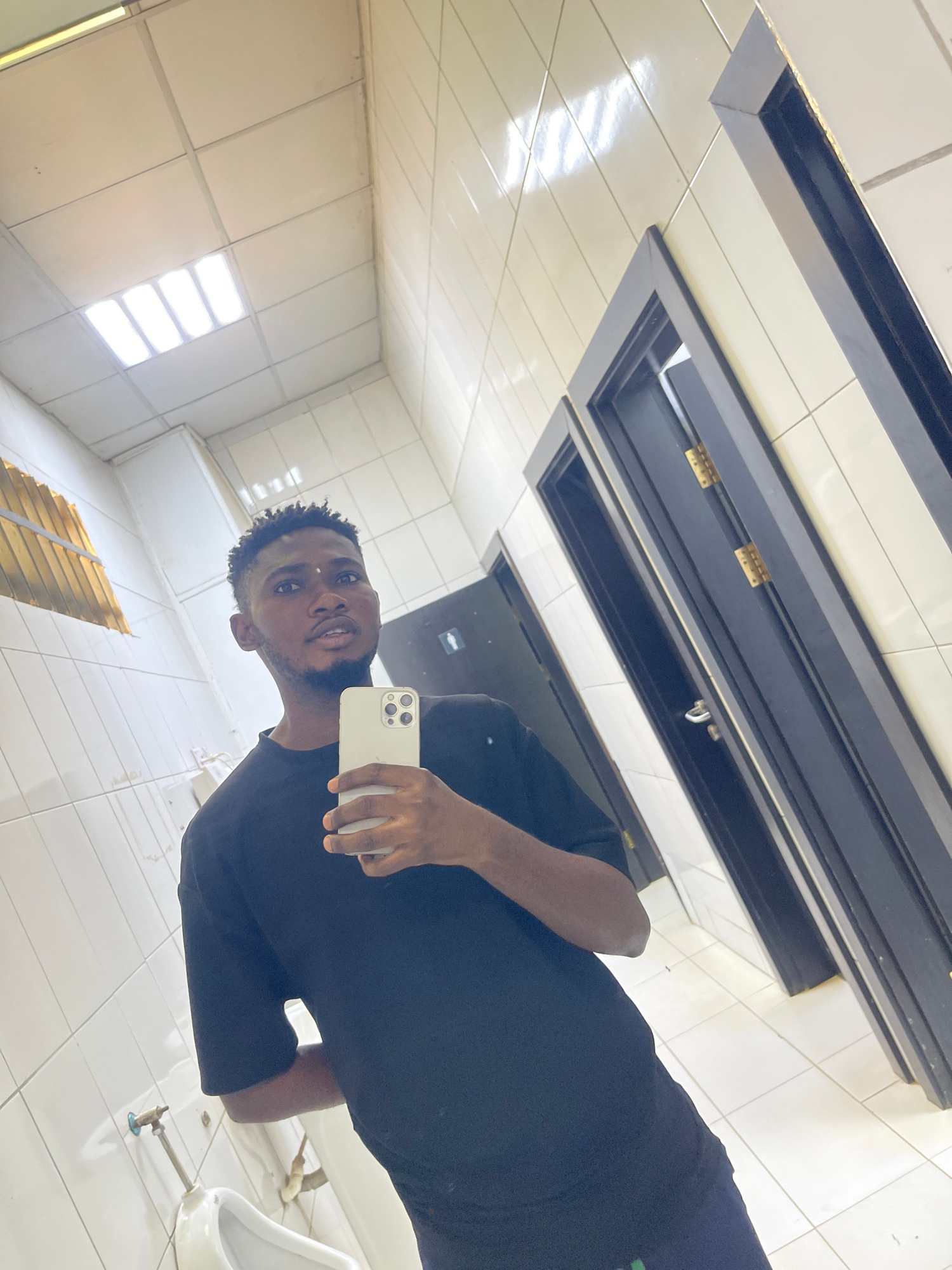 The image displays a young Black man taking a selfie in what appears to be a tiled public restroom in Zaria, Nigeria. The image is presented rotated 90 degrees clockwise. The man is positioned in the…read more