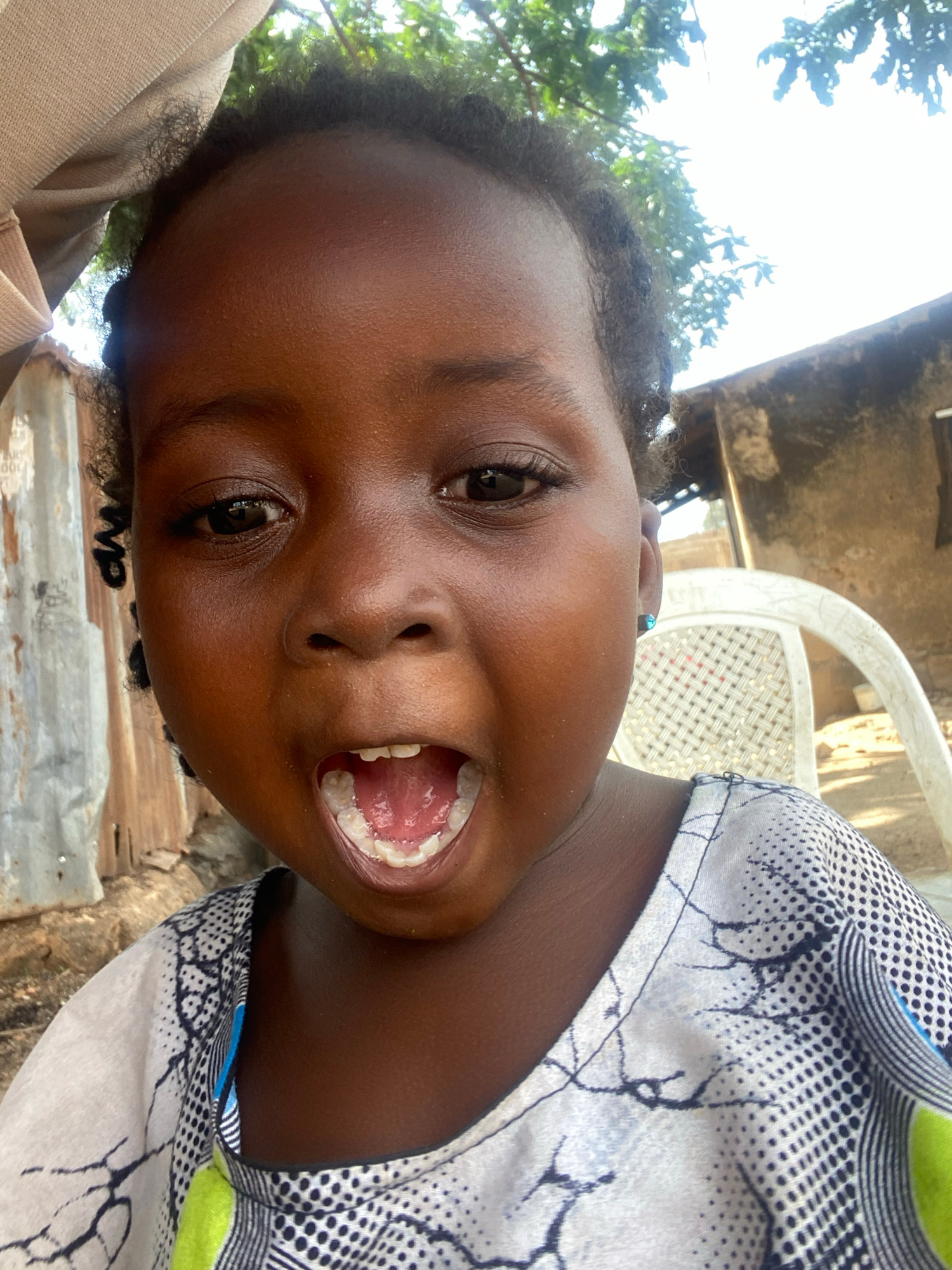A close-up, rotated portrait captures a young child, likely a girl, from Kuru Dungus, Nigeria. She has dark skin and dark, curly hair, and looks directly into the camera with an animated, open-mouthed…read more