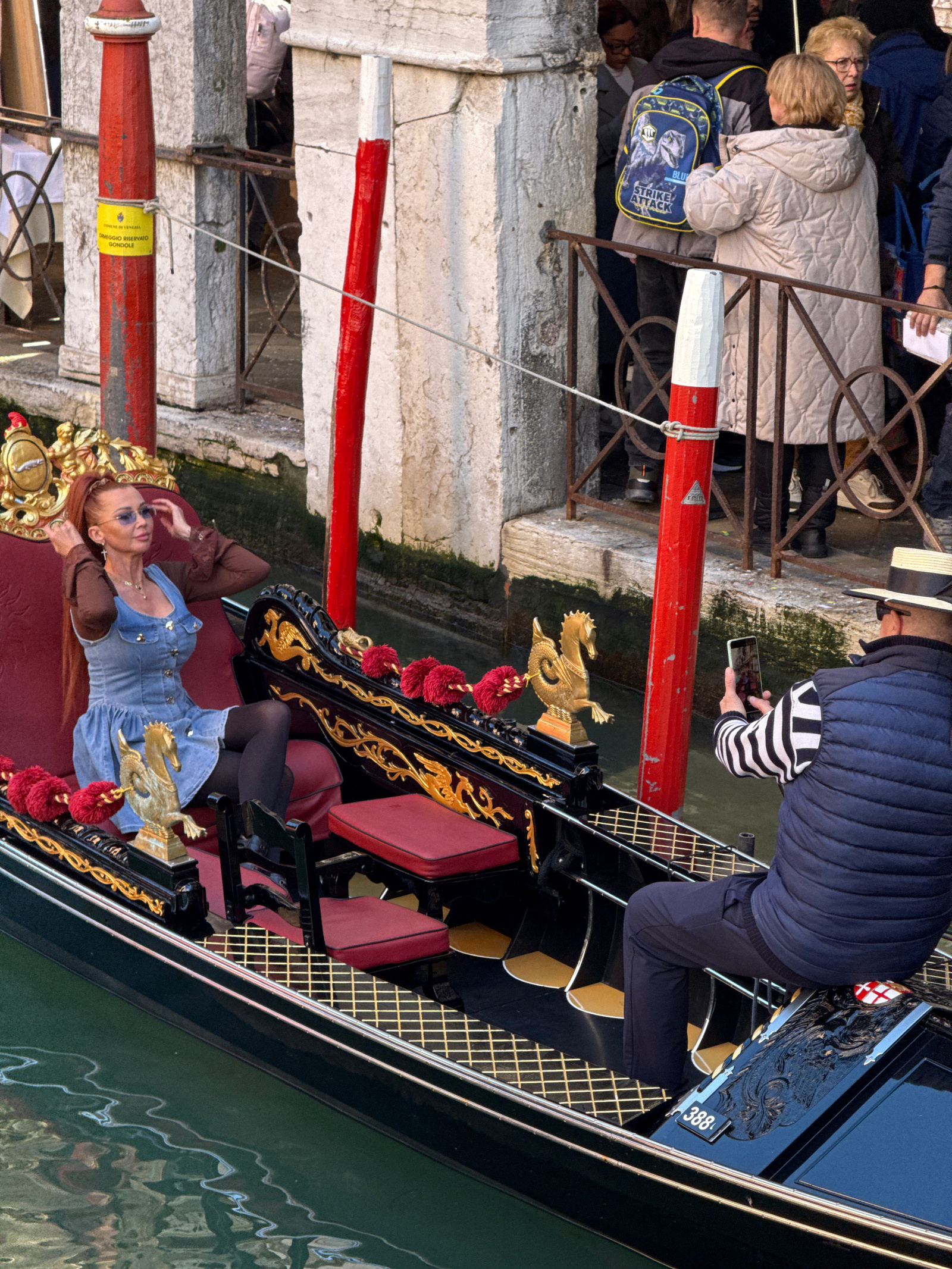 The image depicts a specific scene within a narrow canal in Venice, Italy. A traditional black gondola, adorned with ornate gold detailing, red cushioned seating, decorative golden seahorse-like figur…read more