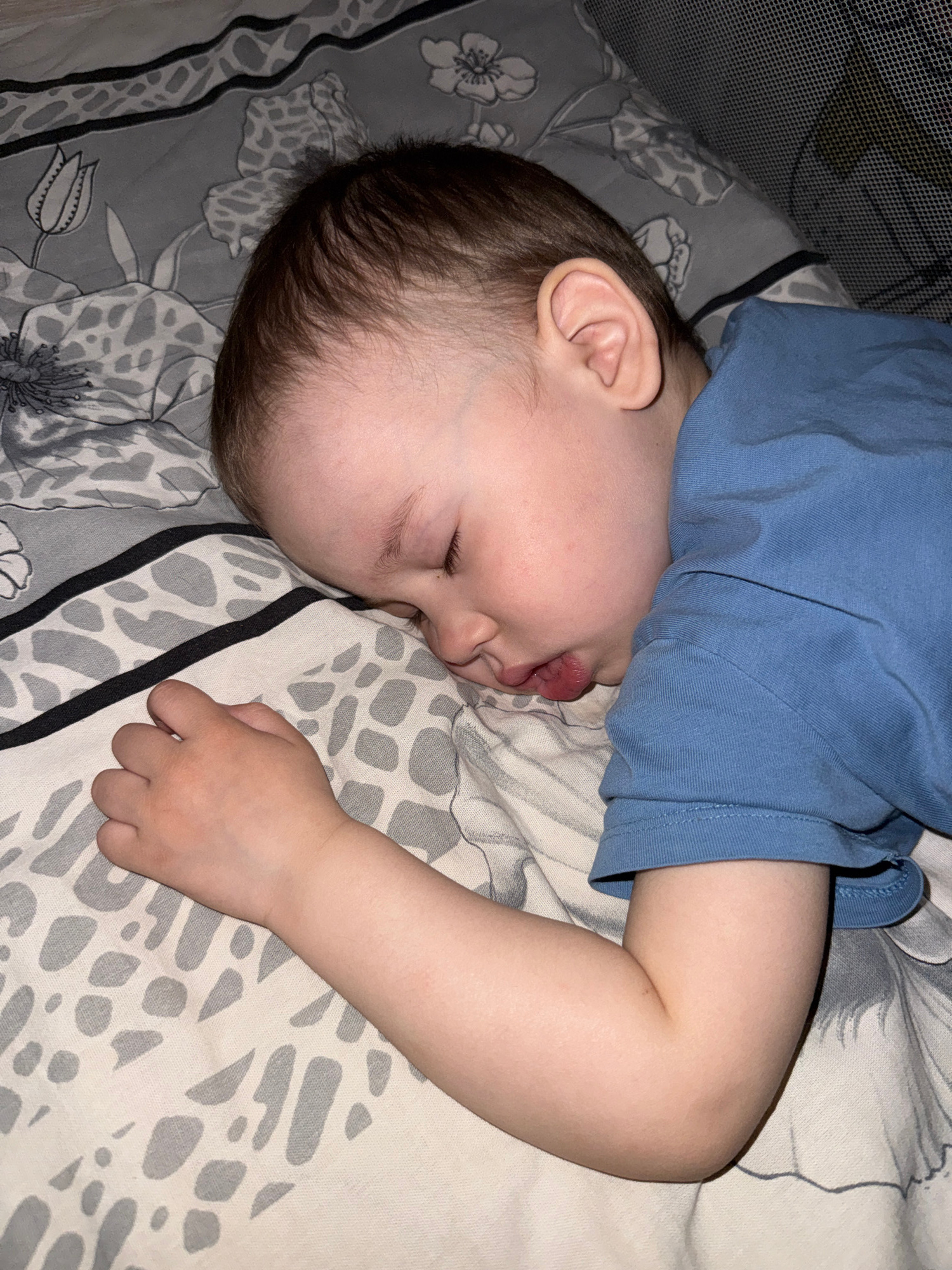 A toddler is asleep on a bed. The child, dressed in a blue shirt, is lying on their side, with their right arm extended out in front of them. The bedding is a patterned grey and white. The child appea…read more