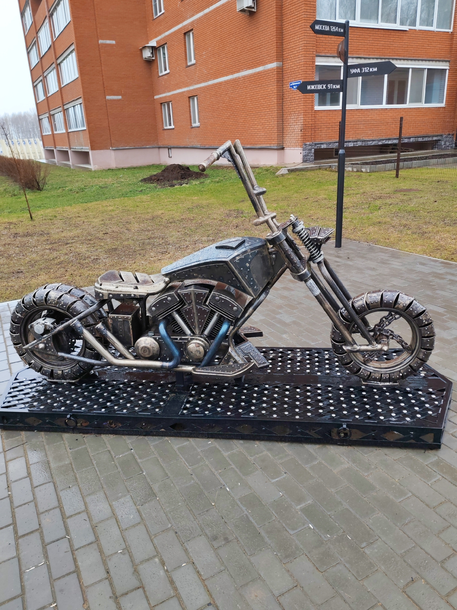 The image depicts a metal sculpture of a motorcycle located in Chaikovsky, Russia. The motorcycle is constructed from various metal components and rests on a black, perforated metal platform. The scul…read more