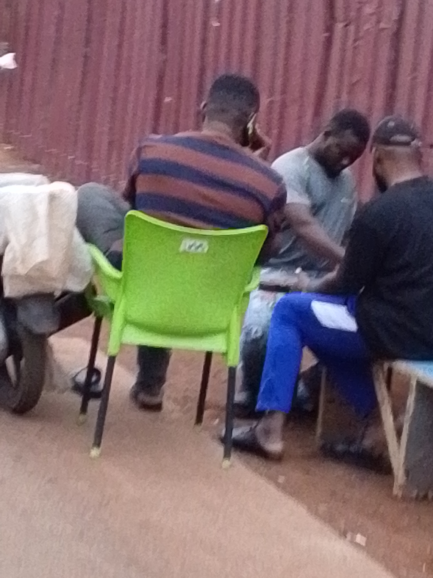Three men are sitting and talking on a dusty surface outdoors, with a red corrugated wall behind them. The man on the left wears a striped orange and black shirt and sits in a green plastic chair. The…read more