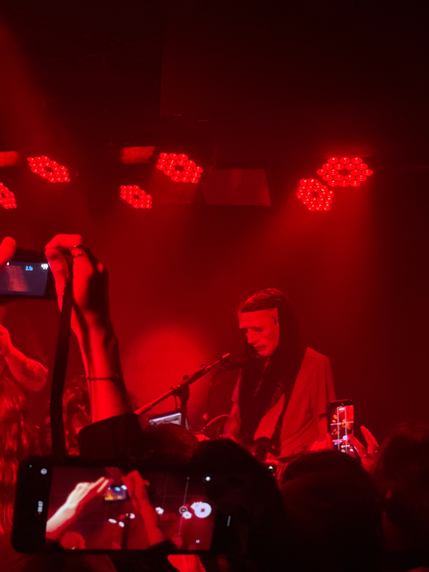 The image shows a performance, possibly a concert, under intense red lighting. A performer with long, dark hair is visible on stage, illuminated by a spotlight. Audience members are holding up their p…read more