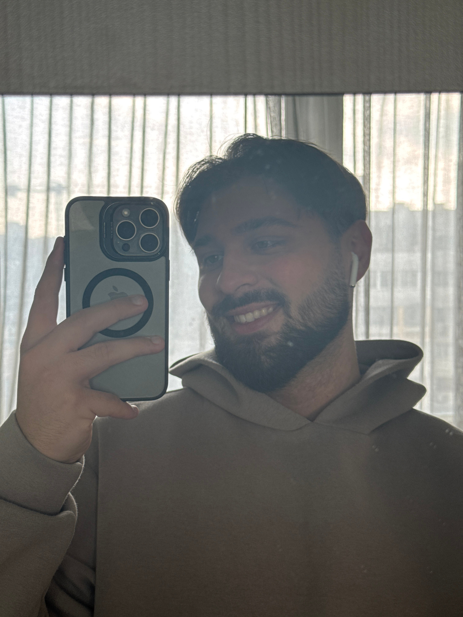 A man with dark hair and a beard smiles while taking a selfie in front of a window with closed blinds. He is wearing an off-white hoodie. He is holding a smartphone with a gray case and a circular mag…read more