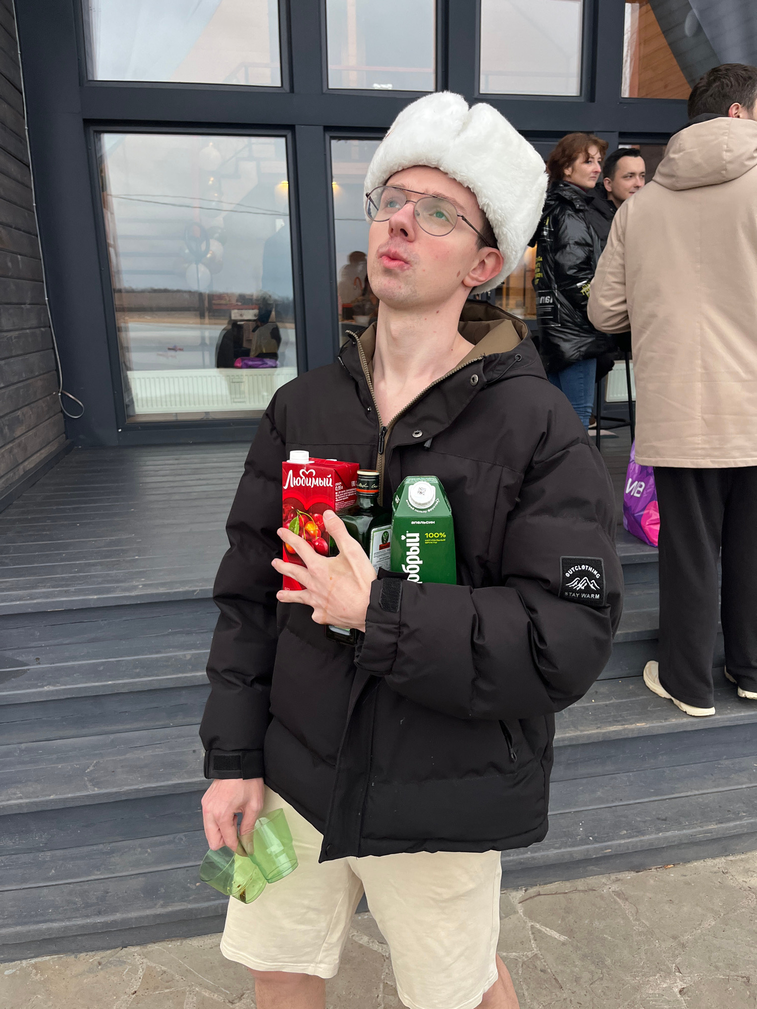 A man wearing a white fur hat and glasses is standing outside a building in Borshchevo, Russia. He is holding a carton of "Любимый" cherry juice, a carton of "Я" juice, and two green plastic cups. He'…read more