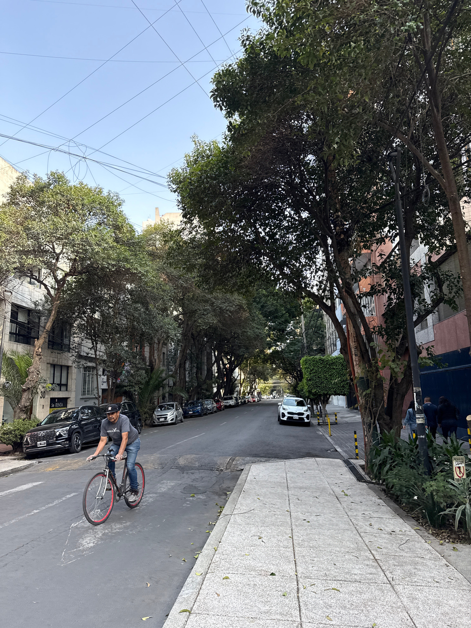 The image shows a street in Mexico City, Mexico, lined with trees and buildings. A man is riding a bicycle in the foreground. Cars are parked along the street, and there is a sidewalk on the right sid…read more