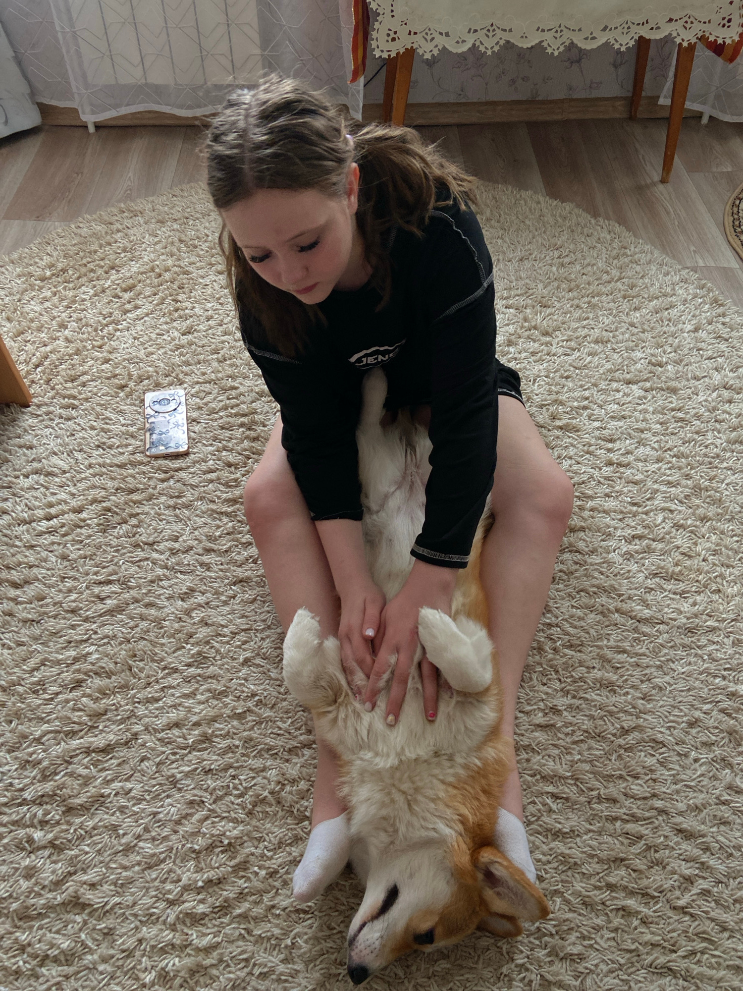 A young girl in a black long-sleeved shirt lies on a beige carpet, cradling a corgi dog on its back. A small, rectangular object with a patterned surface rests near her legs on the carpet. The backgro…read more
