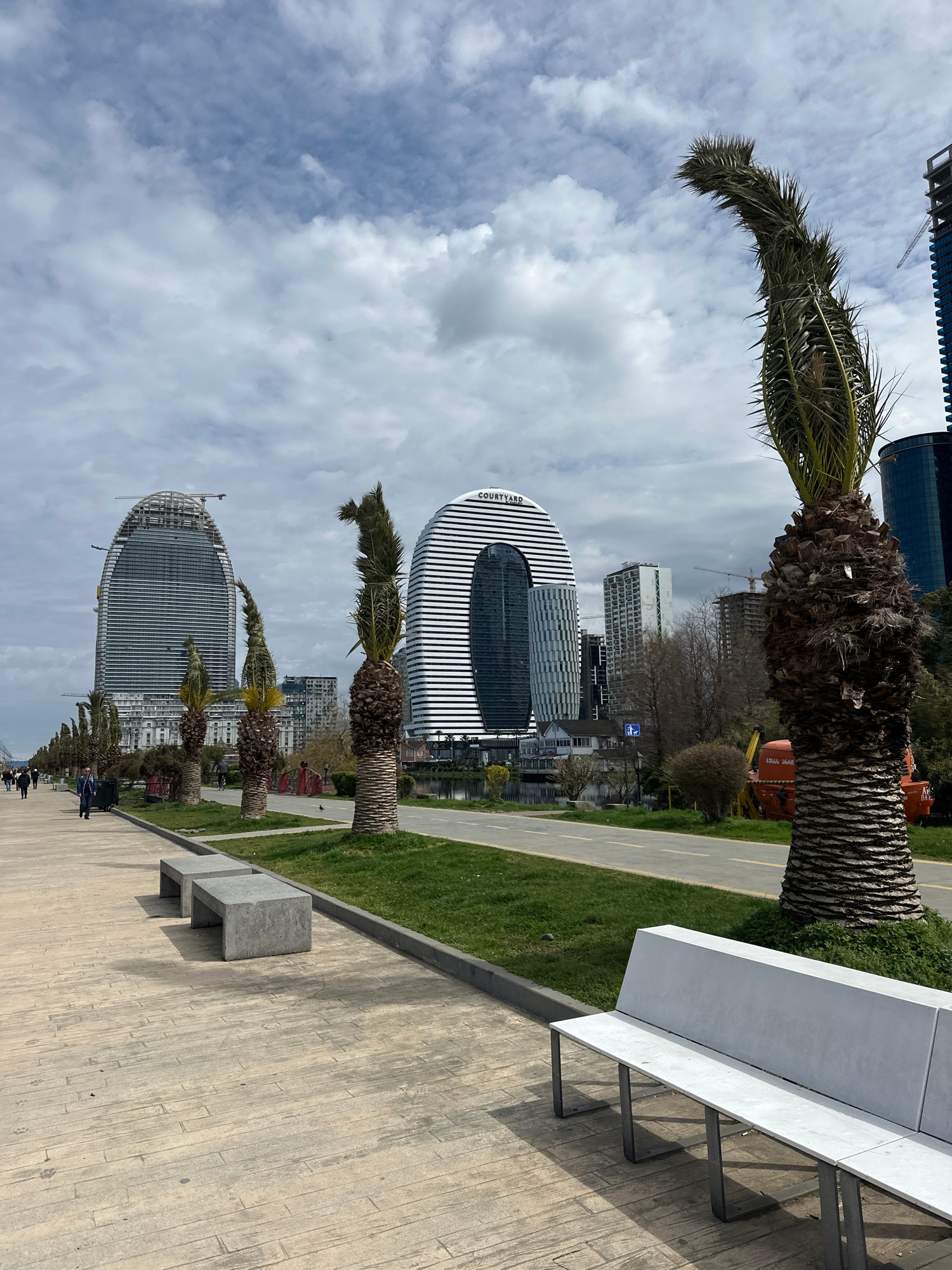 The image shows a promenade in Batumi, Georgia, lined with palm trees and benches. The architecture is modern, with the Courtyard by Marriott Batumi hotel visible, along with other high-rise buildings…read more