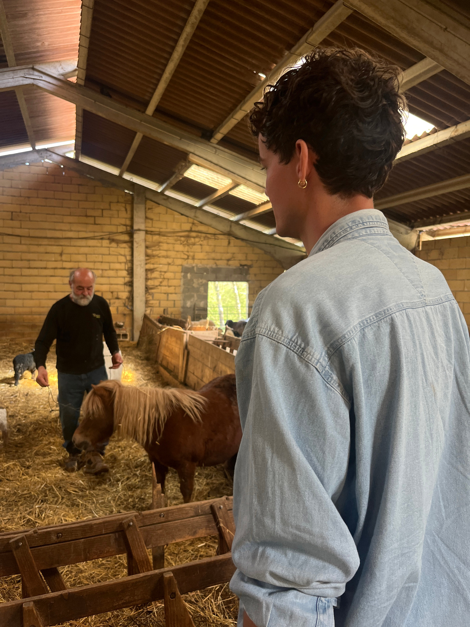 The image depicts the interior of a barn, possibly located in Abadiño, Spain. An individual with dark, curly hair and a gold hoop earring, wearing a light blue denim shirt, is positioned in the upper…read more