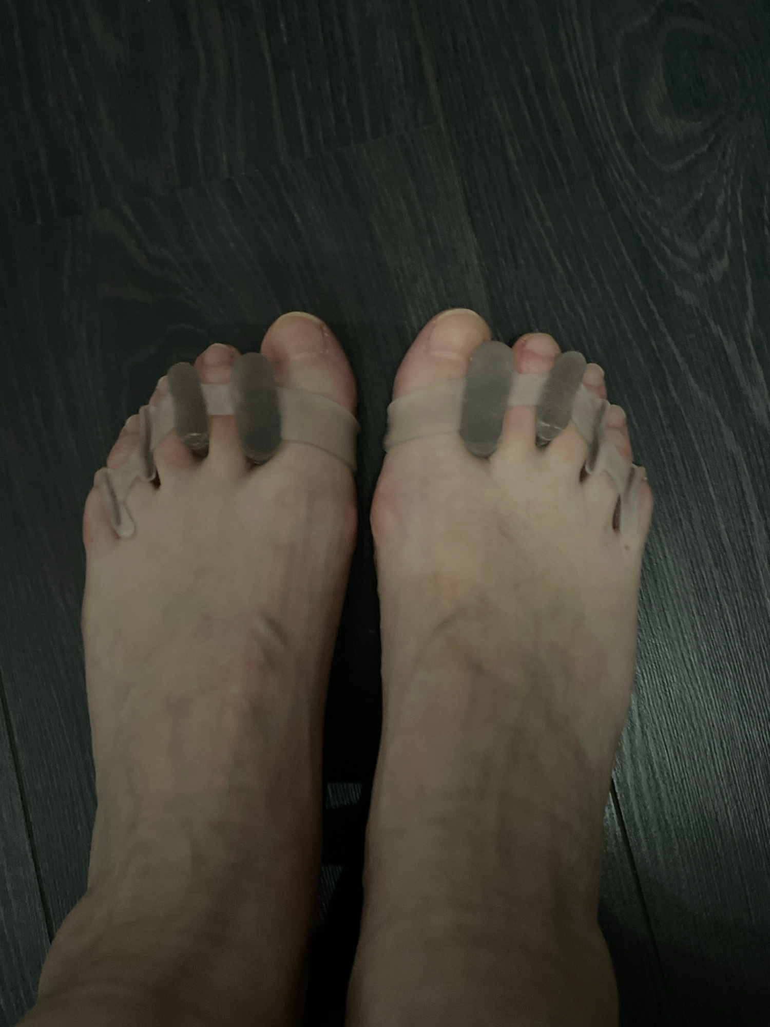 Two feet are displayed against a dark wood-grain background. Each foot has a foot-alignment apparatus inserted between the toes. The location is unknown, and no connection to the city of Moskovskiy, R…read more