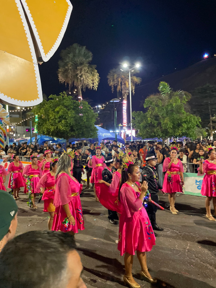A nighttime street scene captures a vibrant parade. Women in bright pink dresses and gold crowns perform, surrounded by spectators. The scene is lit by streetlights and colorful decorations. Trees and…read more