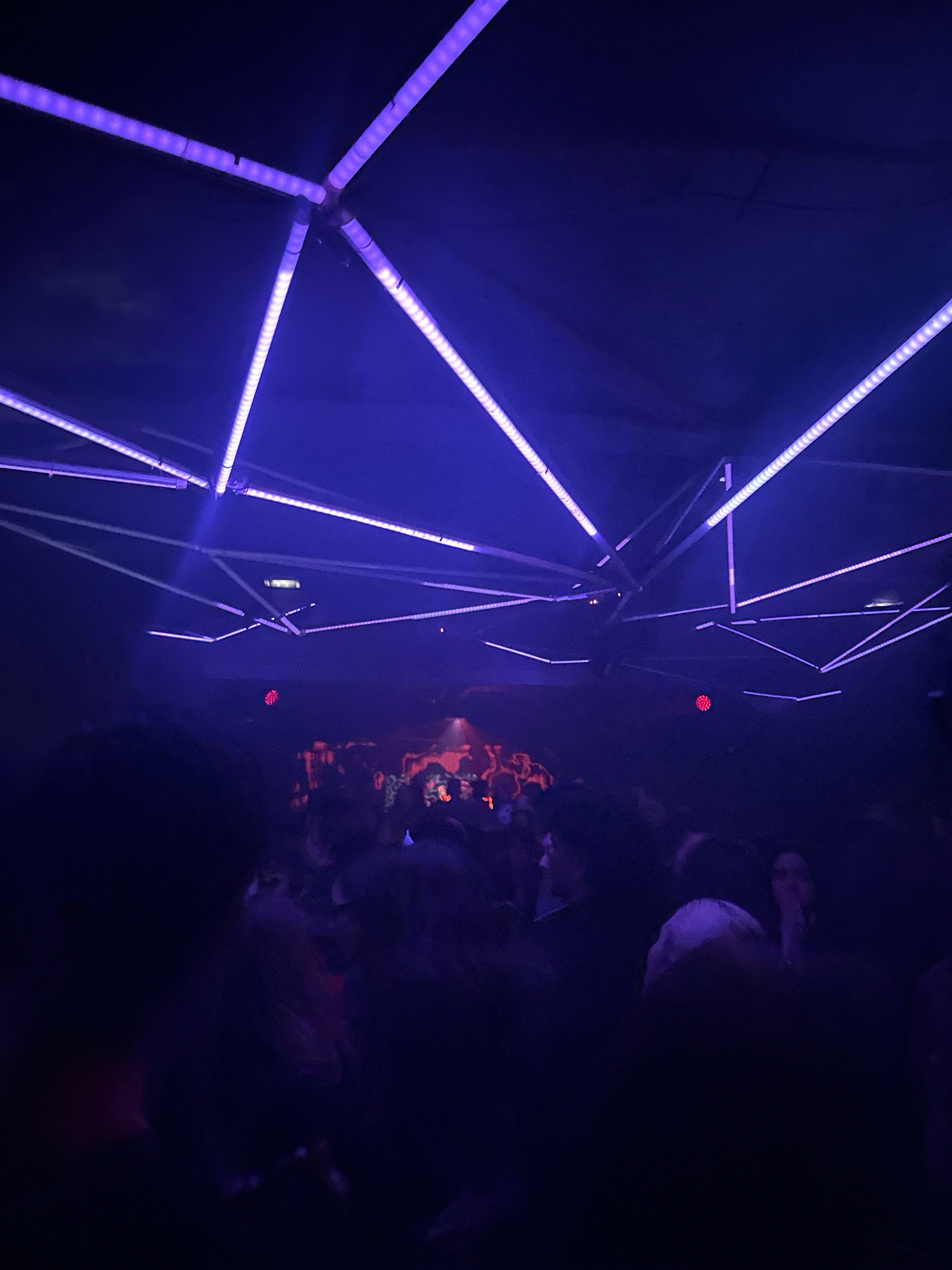 The image displays an indoor scene within a dark, crowded establishment, identified as a nightclub or music venue in Paris, France. The ceiling features a complex geometric array of tubular light fixt…read more