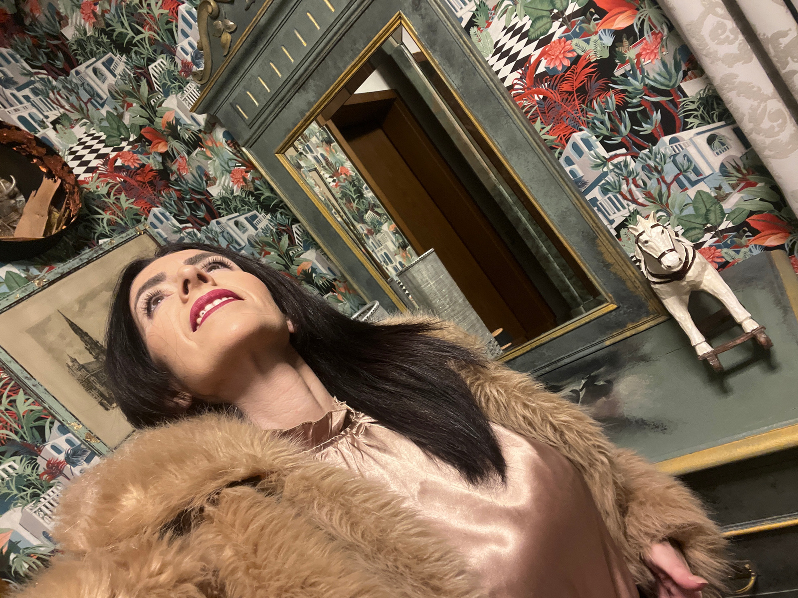 A woman with long dark hair, fair skin, and dark lipstick is lying on a patterned surface. She is wearing a tan fur stole over a pink satin garment. To her left is a muted green dresser with a decorat…read more