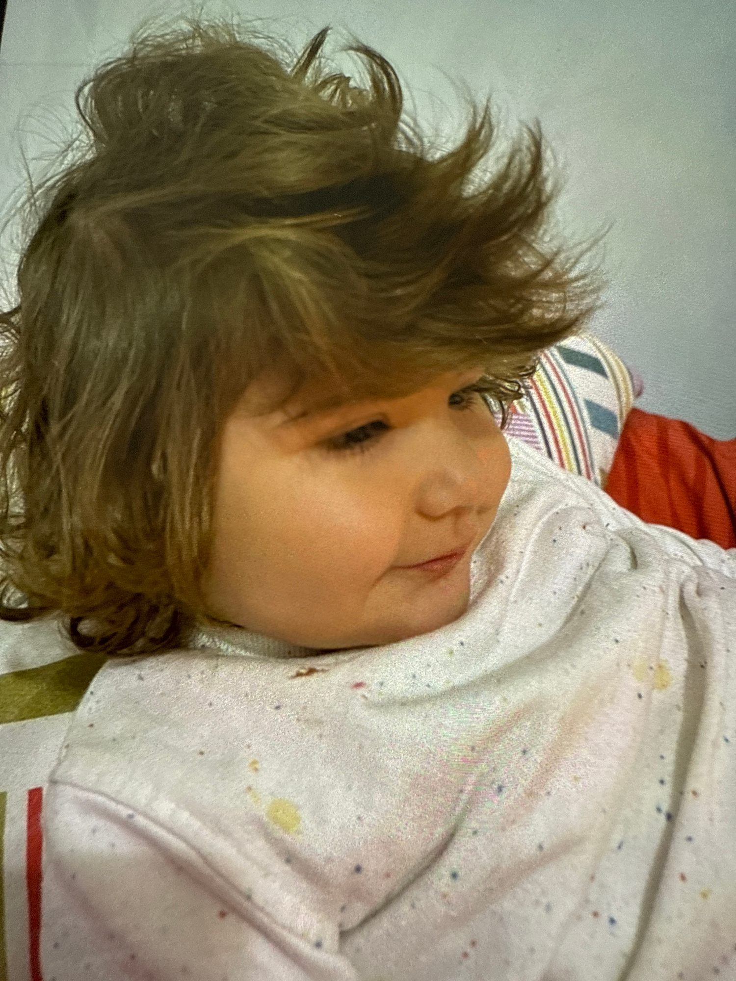 A child lies on a striped pillow or cushion, possibly in Kuklen, Bulgaria. The child is facing the camera with their head turned slightly. They have brown hair that is tousled. The child wears a whiteβ¦read more