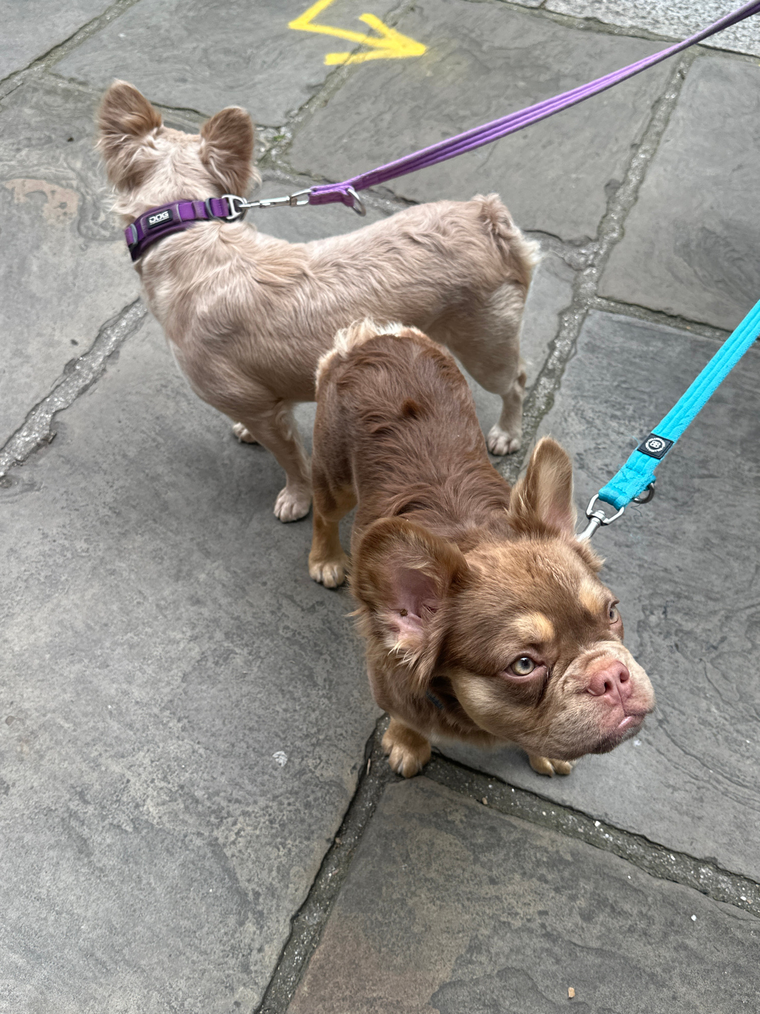 The image depicts two dogs on leashes on a paved surface, possibly a sidewalk. One dog is brown with its head tilted up, wearing a blue leash. The other dog is light beige/tan and wearing a purple col…read more