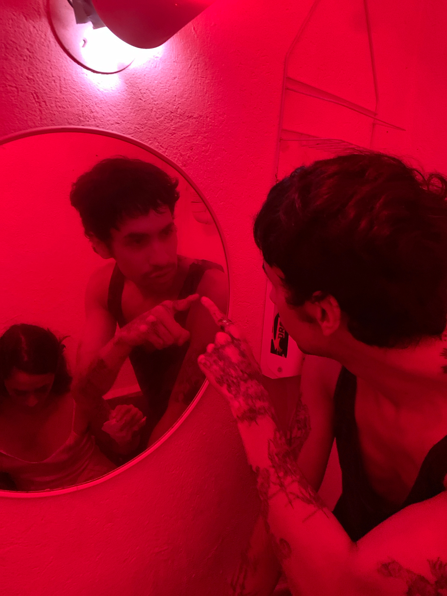 A person with short dark hair, tattoos on their arms, and wearing a tank top, is leaning over a round mirror. The person's reflection is visible in the mirror. The scene is bathed in red light. On the…read more