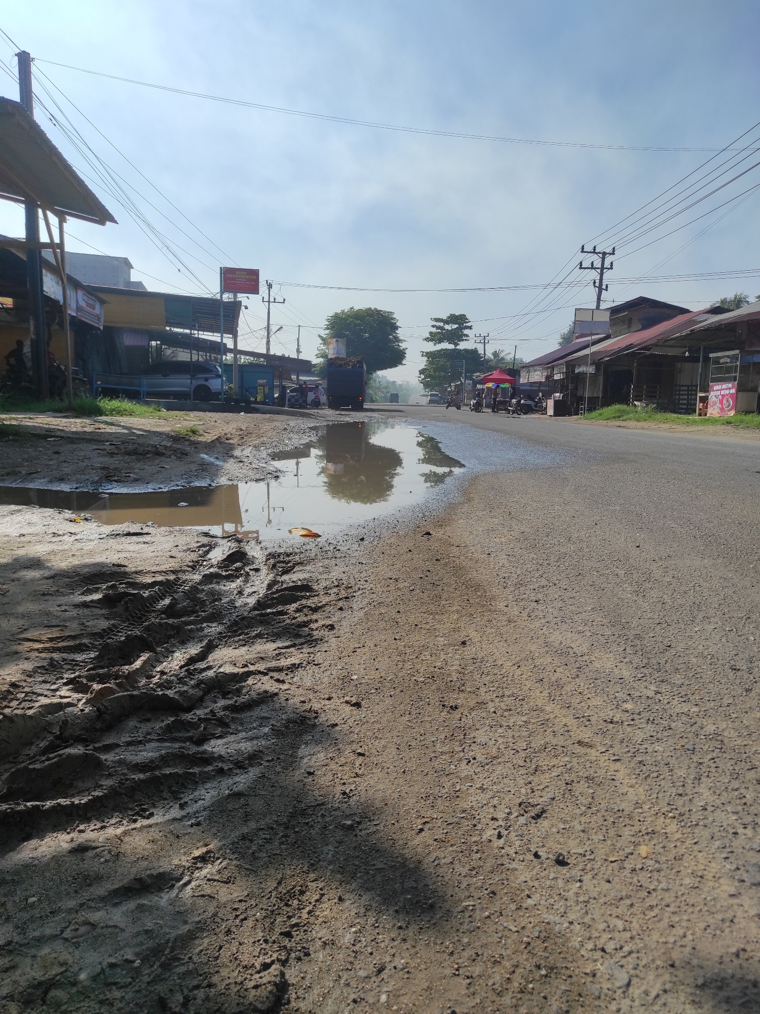 The image depicts a street scene in Lhokseumawe, Indonesia, captured at a low angle, with the road prominently displayed. A large puddle of water reflects the surrounding environment, including buildi…read more
