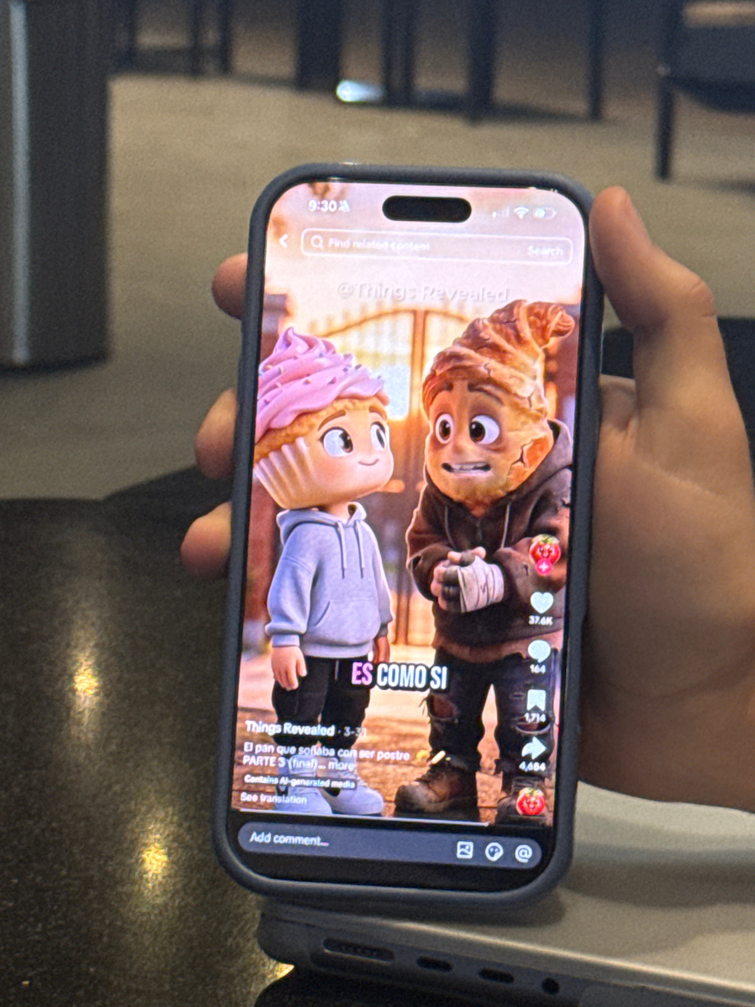A person is holding a smartphone with a TikTok video playing on the screen. The video features animated characters resembling baked goods, specifically bread and a cupcake. The screen displays engagem…read more