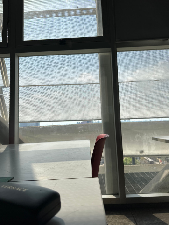 A partial view through a window with a dotted screen shows a cityscape. A maroon shoe rests atop a white surface with vertical scratches. The bottom right reveals a dark case with the word "VERSACE" i…read more