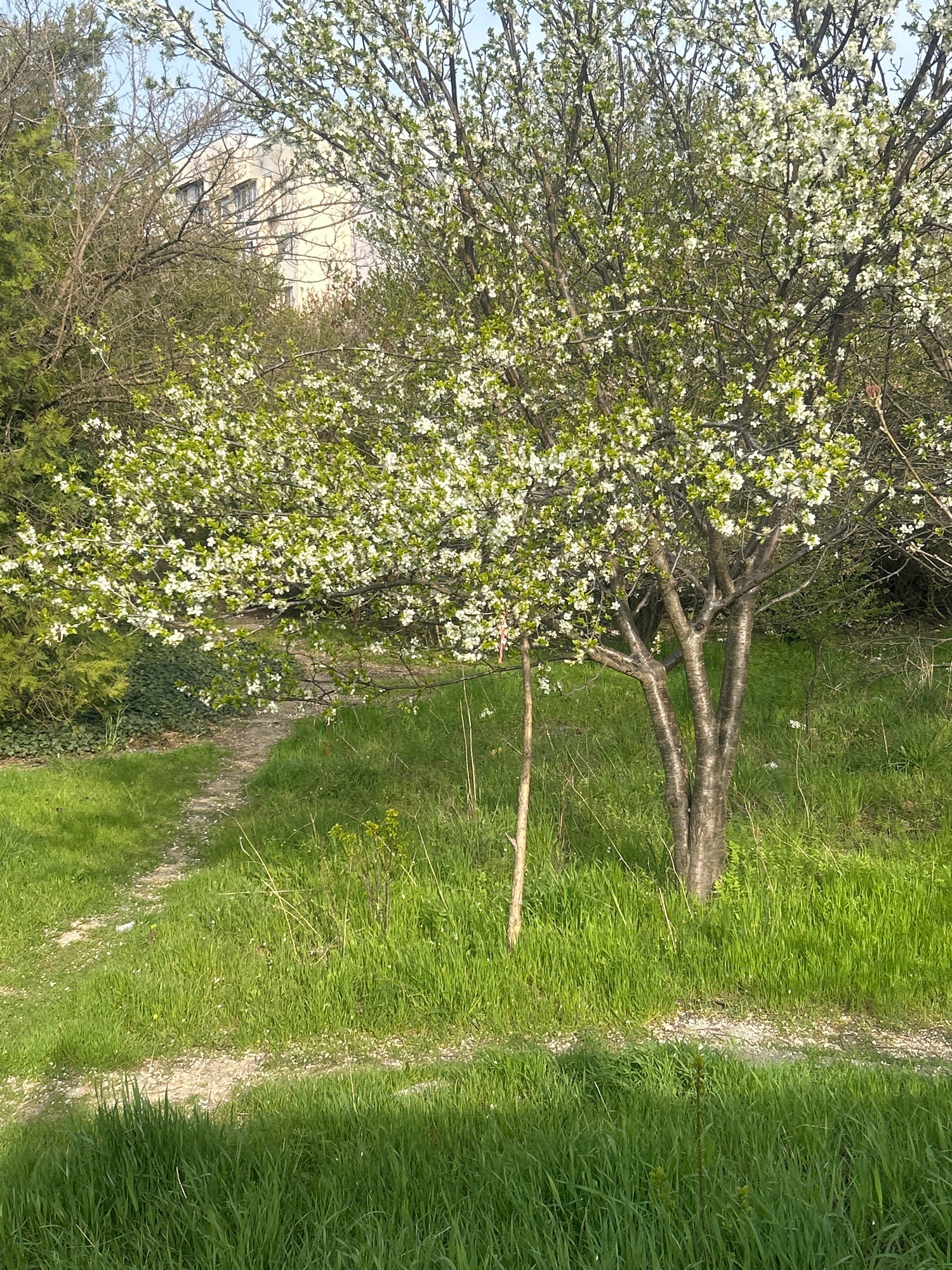 The image captures a landscape scene in what appears to be a park or garden-like setting. A tree, densely covered in white blossoms, dominates the left side of the frame. Its branches extend towards t…read more