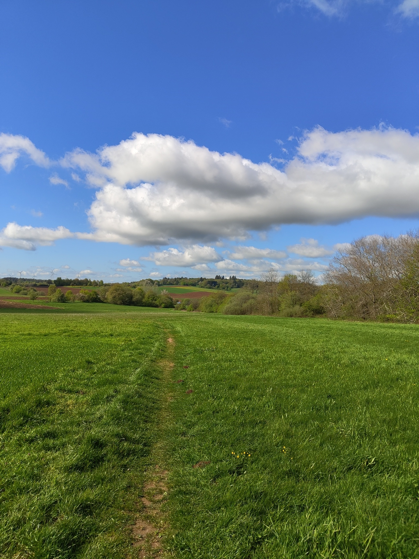 The image shows a field in Mettlach, Germany, under a partly cloudy sky. The field is mostly green grass with some patches of brown earth suggesting a path. A line of trees separates the field from a…read more