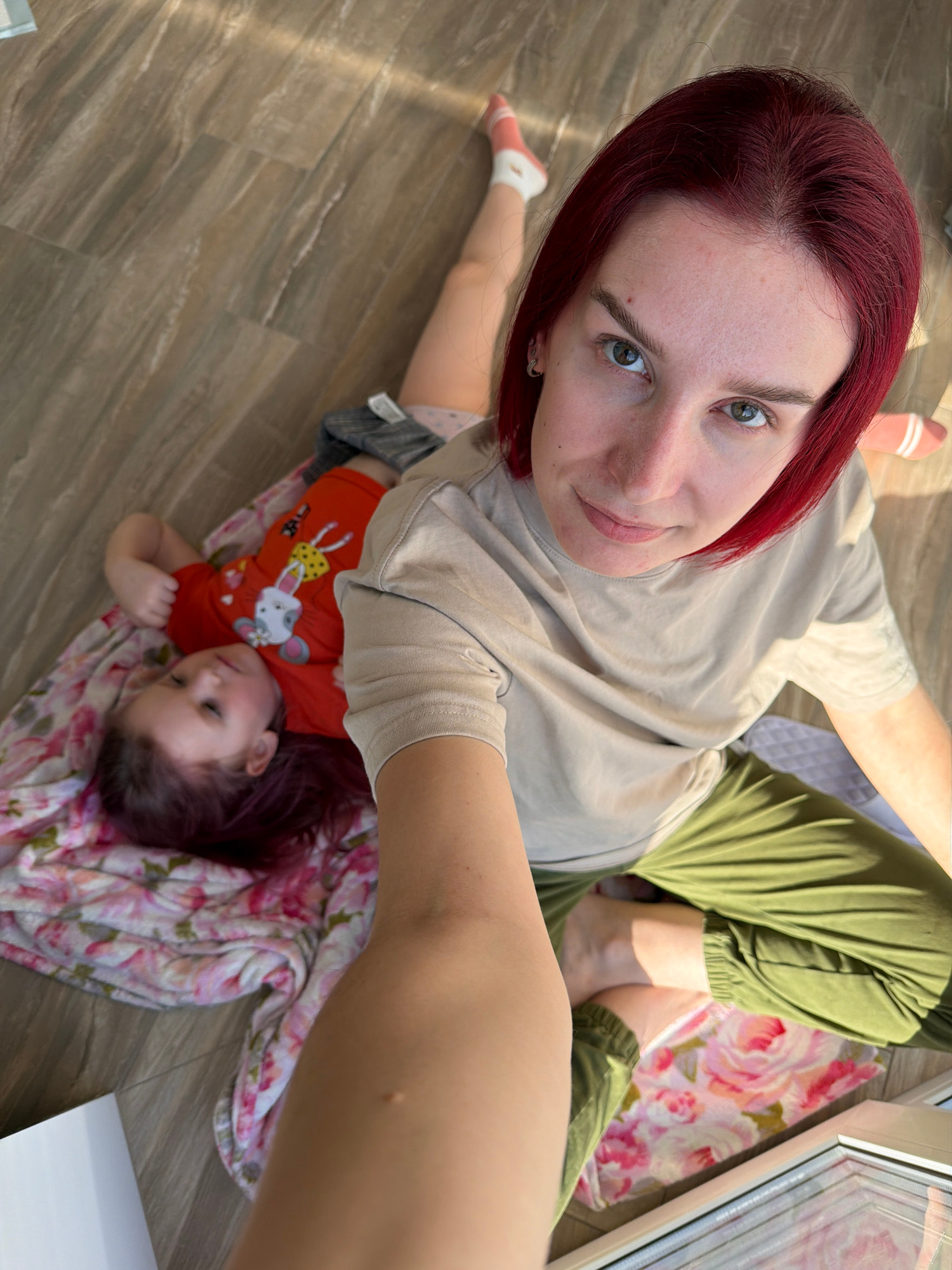 A woman with dark red hair is taking a selfie from a high angle. She is wearing a beige shirt and green pants. A young child with brown hair is lying on a floral patterned blanket, wearing an orange s…read more