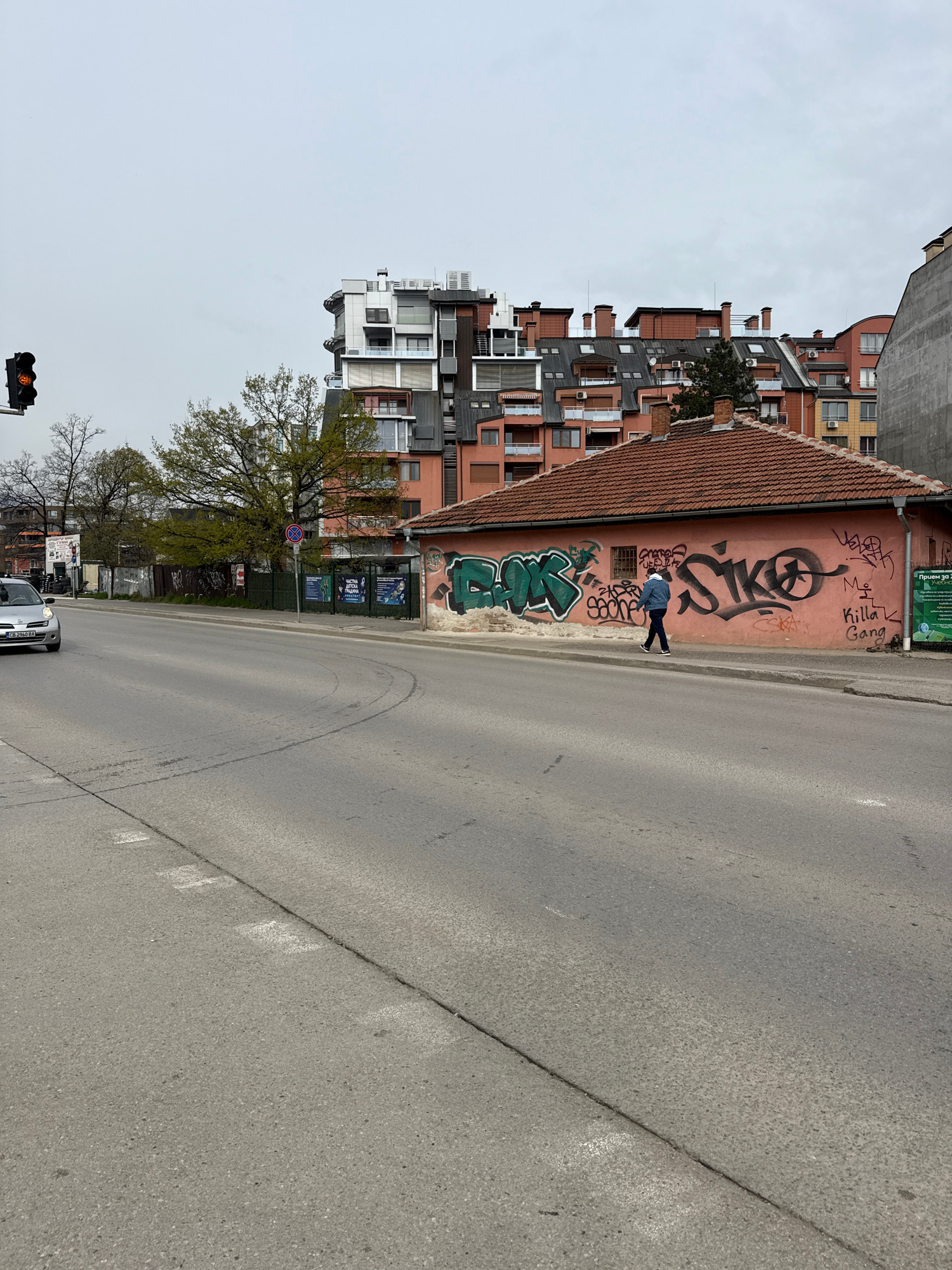 The image depicts a street scene in Sofia, Bulgaria, with buildings and a road. A person is walking along the sidewalk beside a pink building covered in graffiti. The road has tire marks, indicating vā¦read more