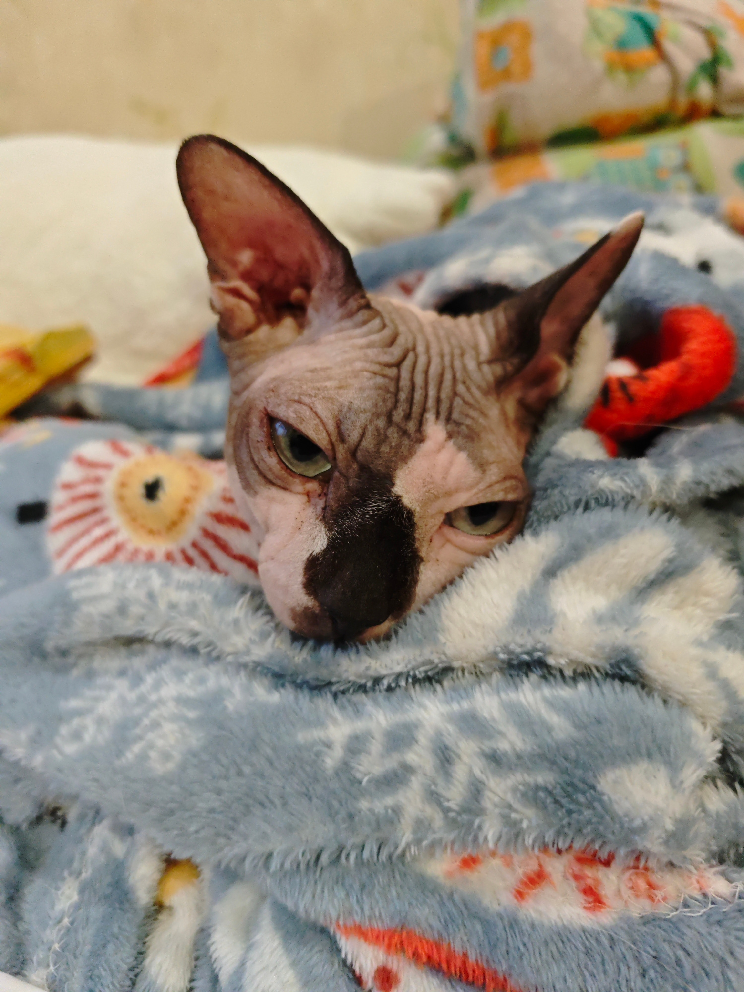 A hairless cat with black and pink markings is lying on a blue and white fuzzy blanket. The cat's head is positioned towards the viewer. The cat has large pointed ears and green eyes. In the backgroun…read more