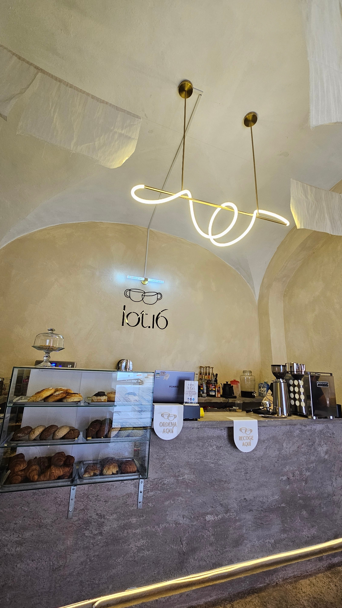 This media file captures the interior of a modern coffee shop or bakery, likely located in Puebla, Mexico, given the Spanish text. The perspective is rotated 90 degrees clockwise, presenting the wall…read more