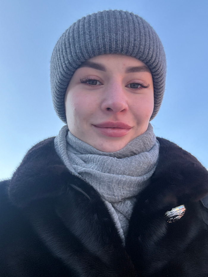 The image displays a head-and-shoulders portrait of a single female individual centered against a clear blue sky. She possesses light skin and is looking directly into the camera with a subtle, closed…read more