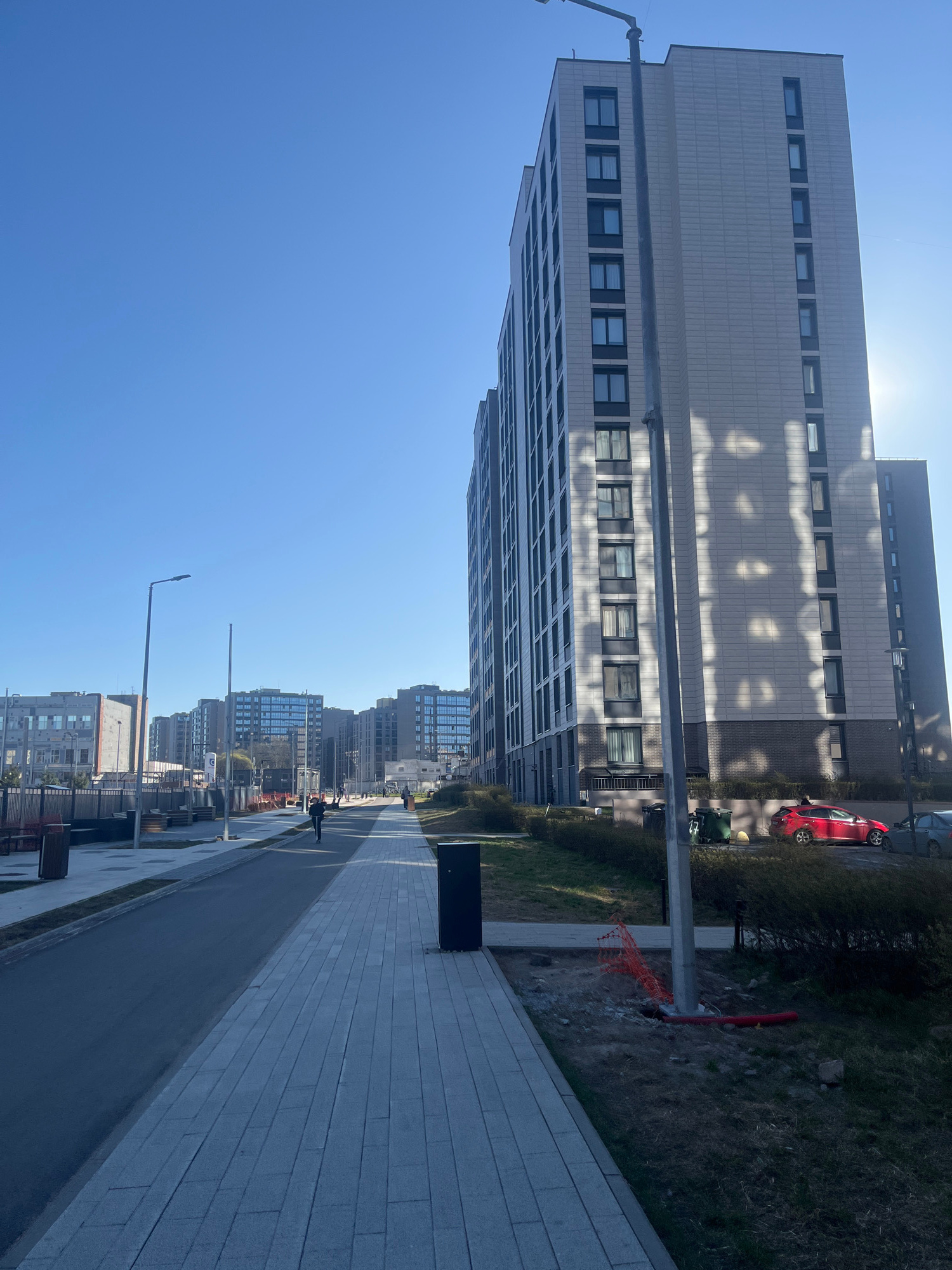 The image depicts a bright, sunny urban street scene in Saint Petersburg, Russia. A tall, modern building with a light-colored facade and numerous dark-framed windows dominates the left side of the fr…read more
