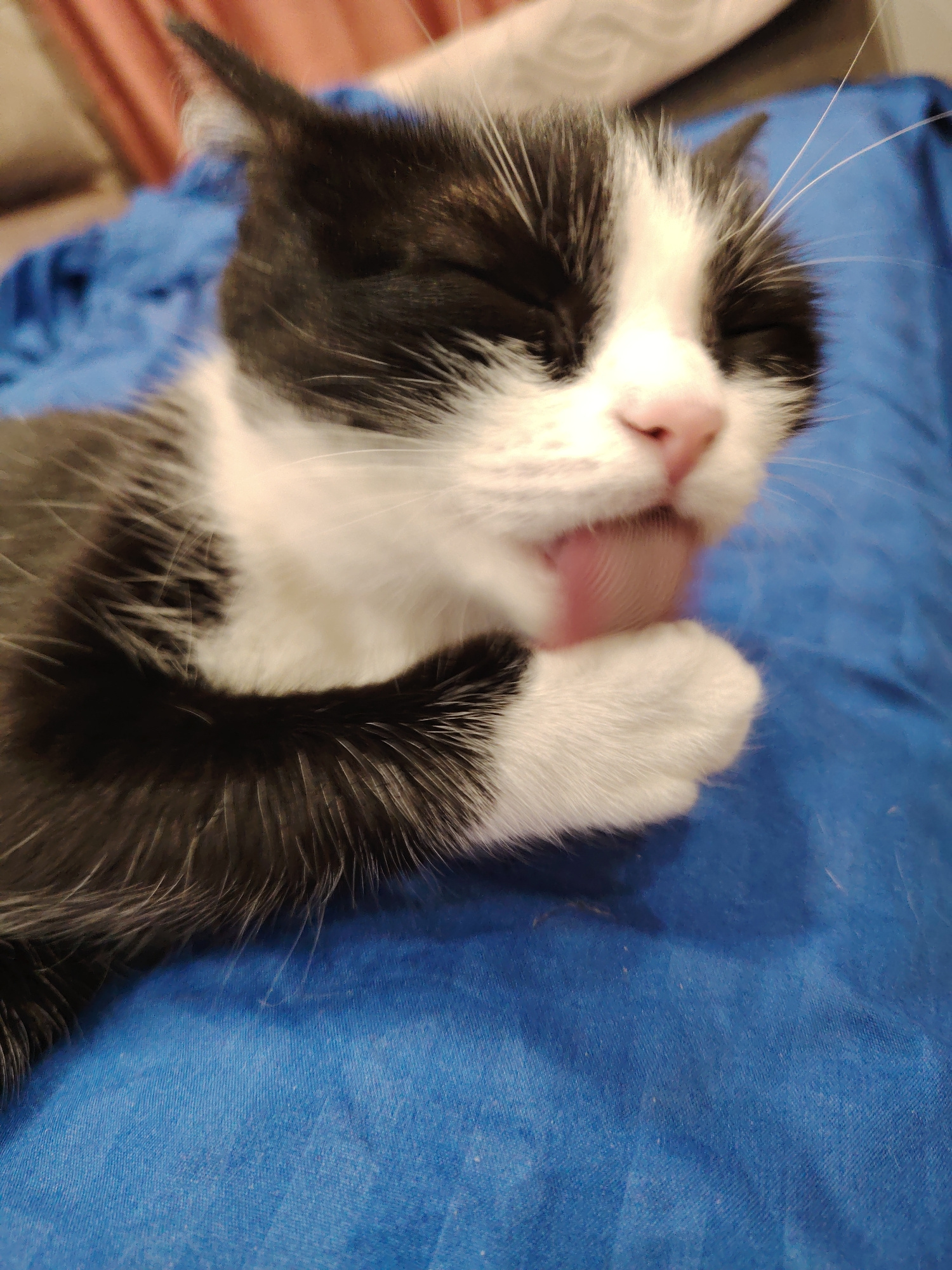 A close-up shows a black and white cat lying on a blue surface. The cat's eyes are closed and its tongue is extended, licking its front paw. The cat's fur is primarily black with white patches on its…read more