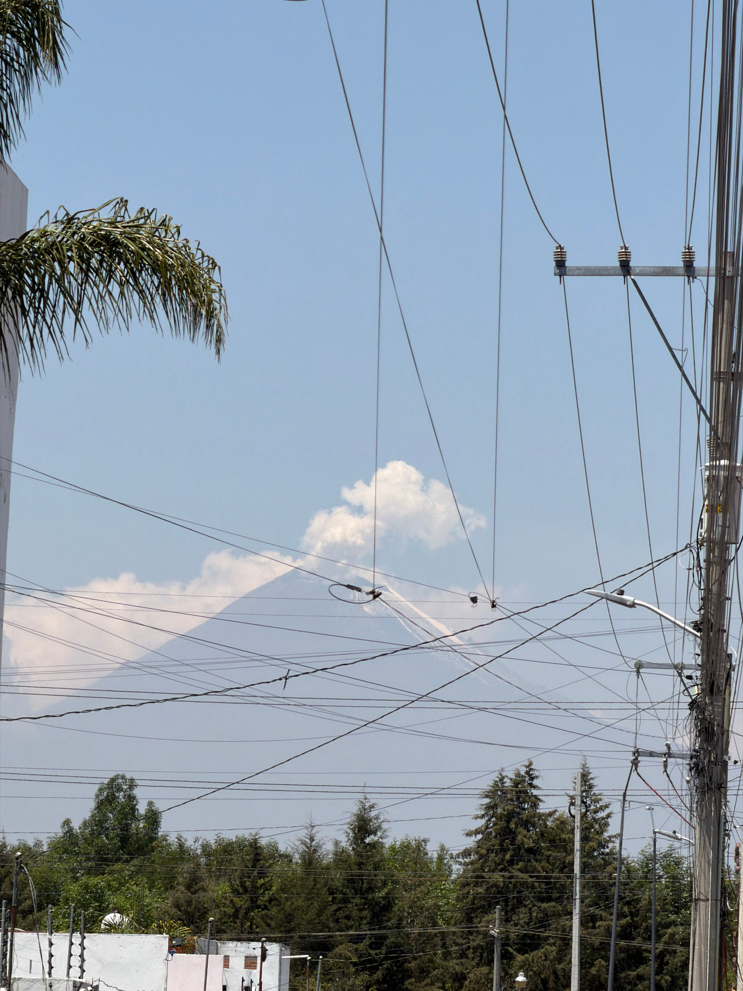 The image depicts a sky filled with utility poles and wires in San Andrés Cholula, Mexico. A palm tree is visible at the bottom left. A cloud is in the center of the frame. Trees and buildings are alo…read more