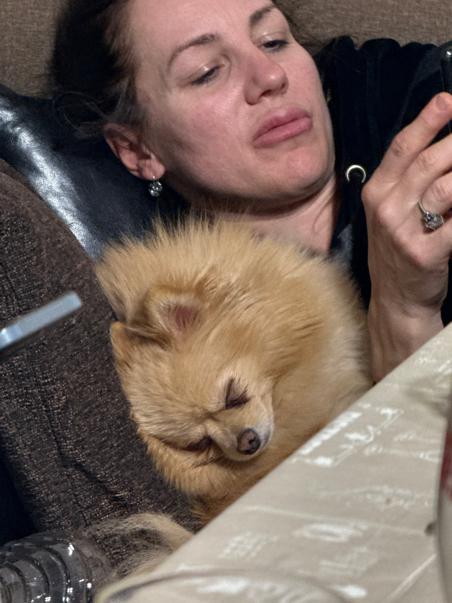 The image depicts a woman lying down with a small, fluffy, golden-brown dog resting on her chest. The woman's face is visible, showing closed eyes. She is wearing a black top with a silver 'C' detail.…read more