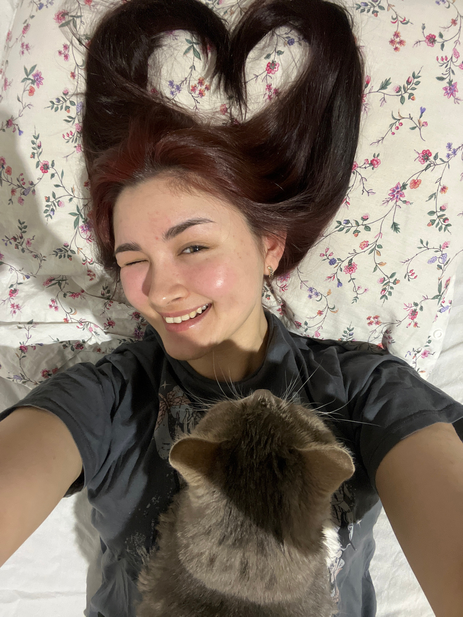 A young woman lies on a bed covered in a floral-patterned sheet. Her long, dark hair is spread out, partially forming a heart shape. She is smiling and winking at the camera. A grey tabby cat is close…read more
