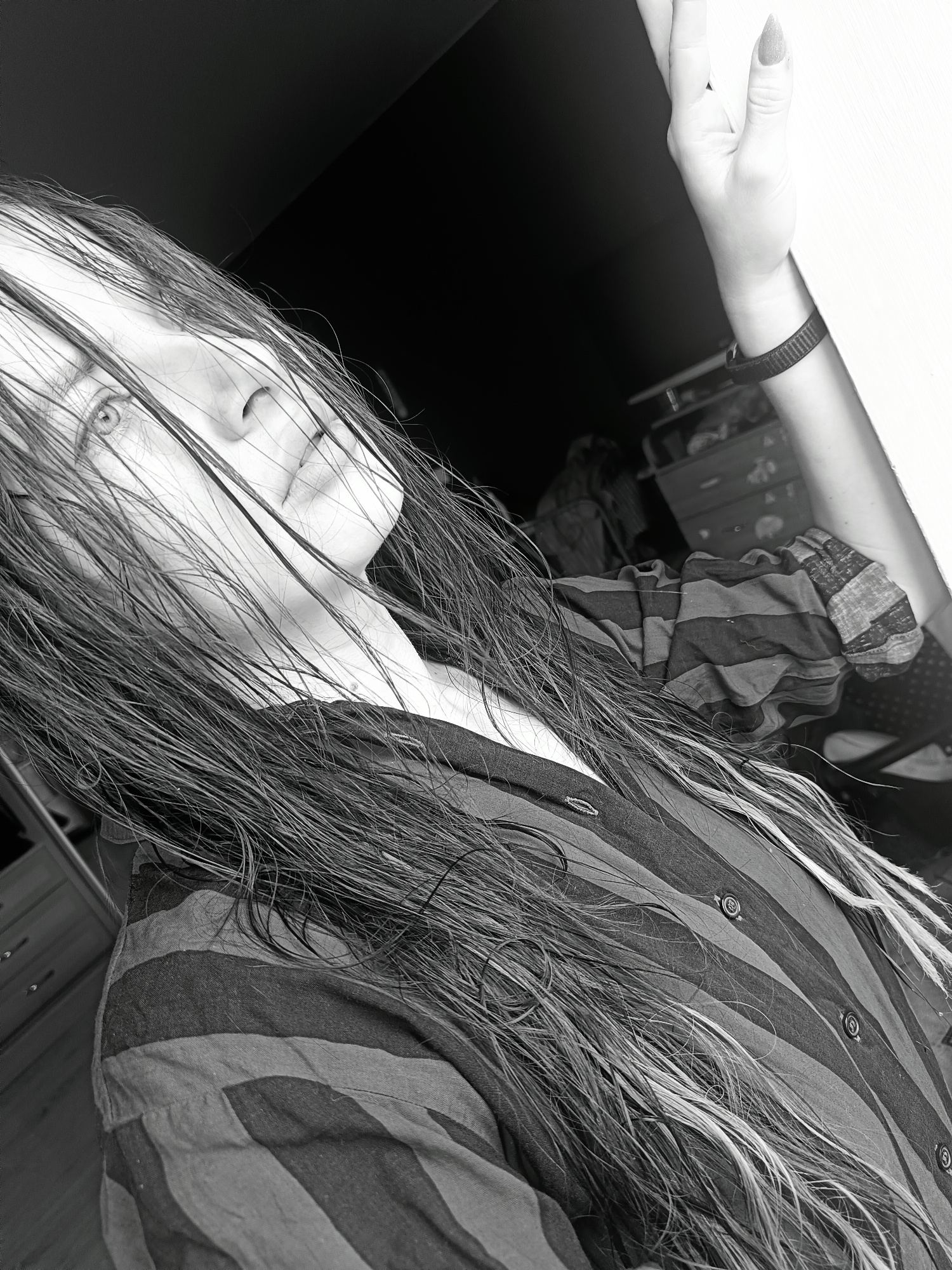 A grayscale, angled close-up photograph shows a person with long, wet hair obscuring their face, wearing a striped, button-down shirt. The person's left hand is raised towards the top right corner of…read more