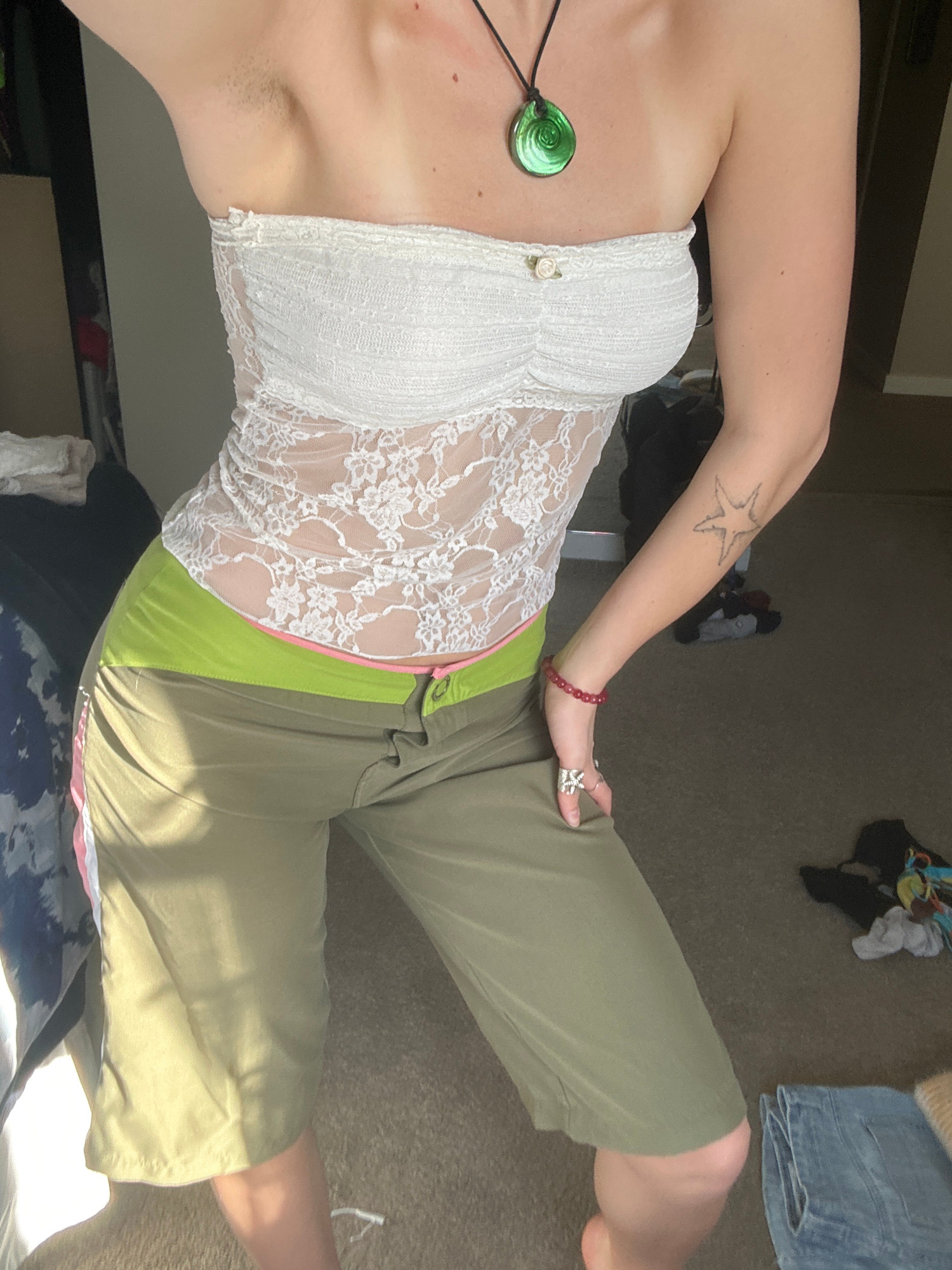 A fair-skinned individual is positioned indoors. The person is wearing olive green capri pants with a lime green and pink waistband. The individual is also wearing a white lace top. A green pendant ha…read more