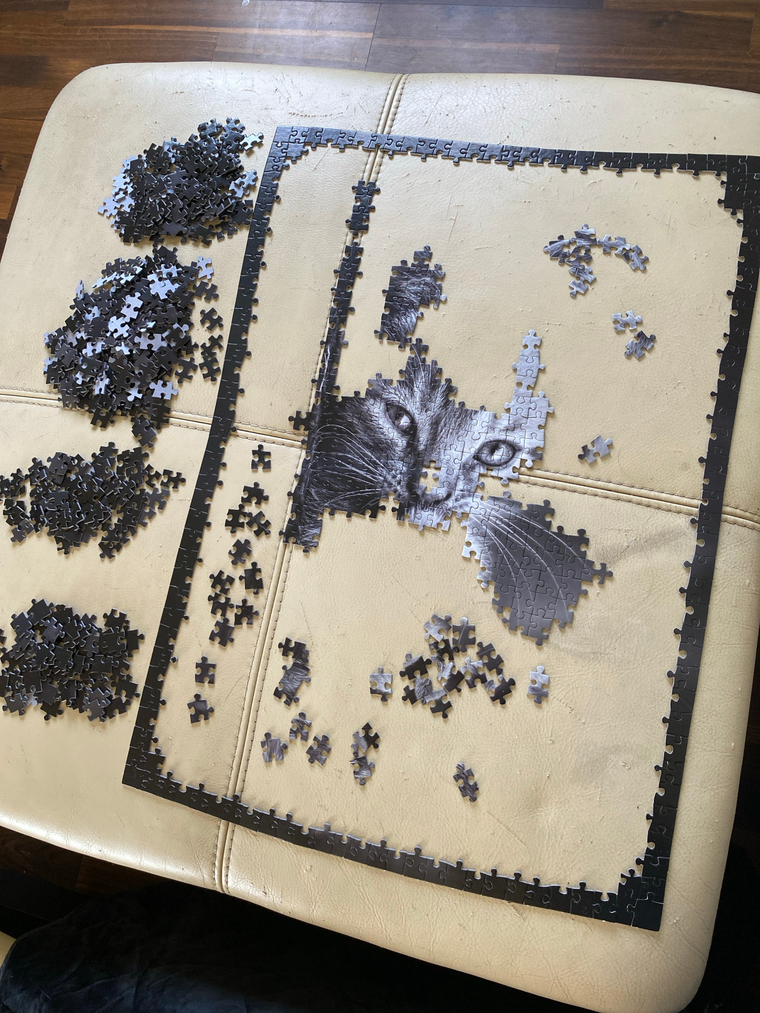 A jigsaw puzzle of a cat is partially assembled on a beige ottoman. The puzzle's border is complete. Some of the cat's head is assembled in the center of the puzzle, with piles of unassembled pieces s…read more