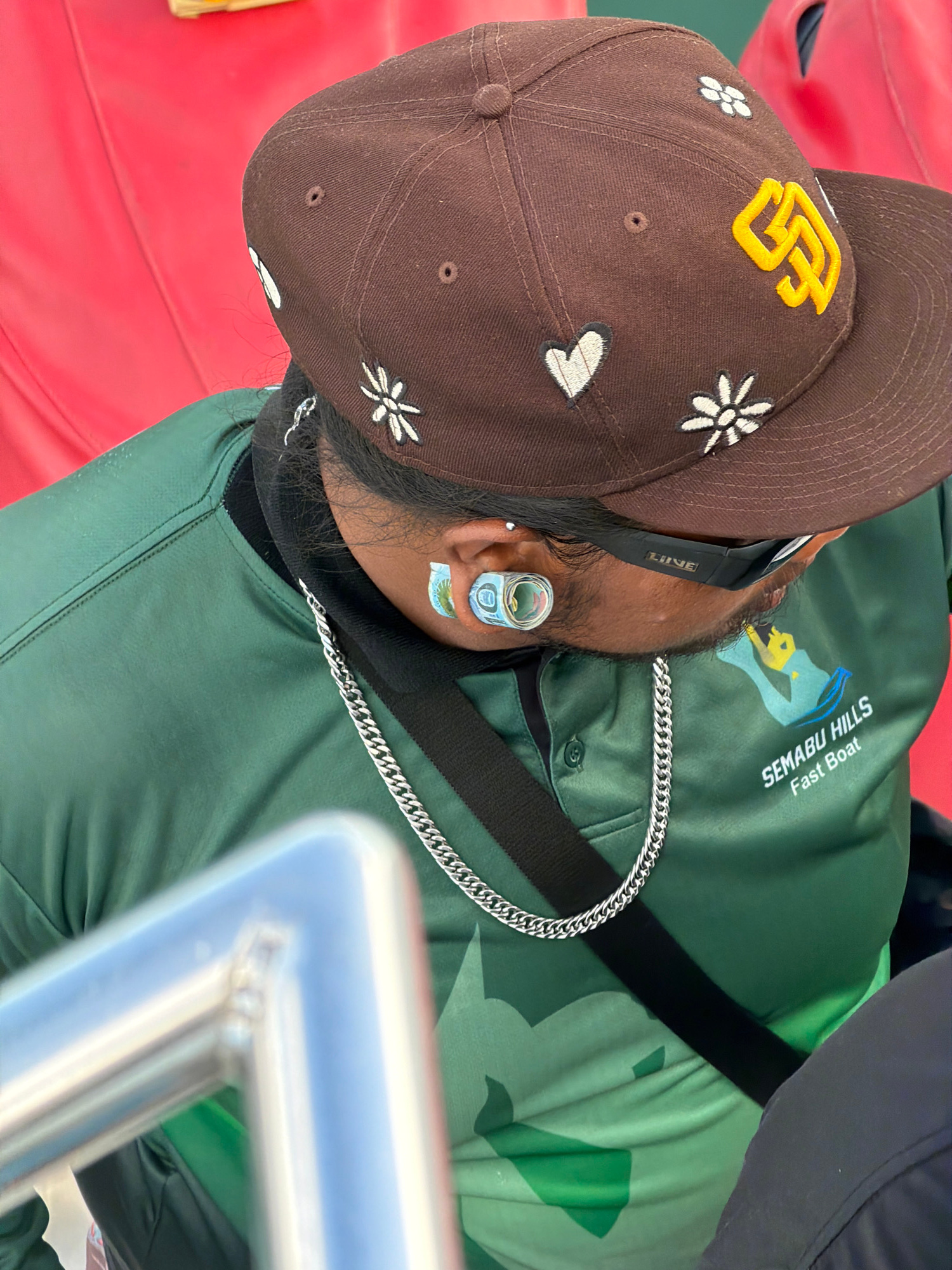 The image shows a close-up, angled view of a person, likely male, from the neck up, adorned with a baseball cap and a silver chain. The person is wearing a dark green shirt or jacket with the white te…read more