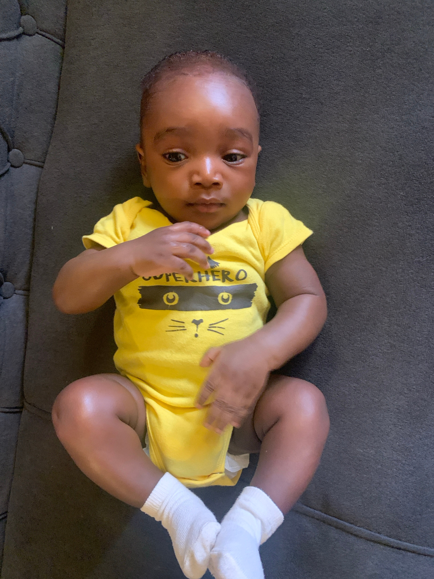 A baby lies on a gray tufted couch. The baby wears a yellow onesie with a black cat-like superhero emblem on the front and white socks on the feet. The location in the city of Barakin Akawo, Nigeria,…read more