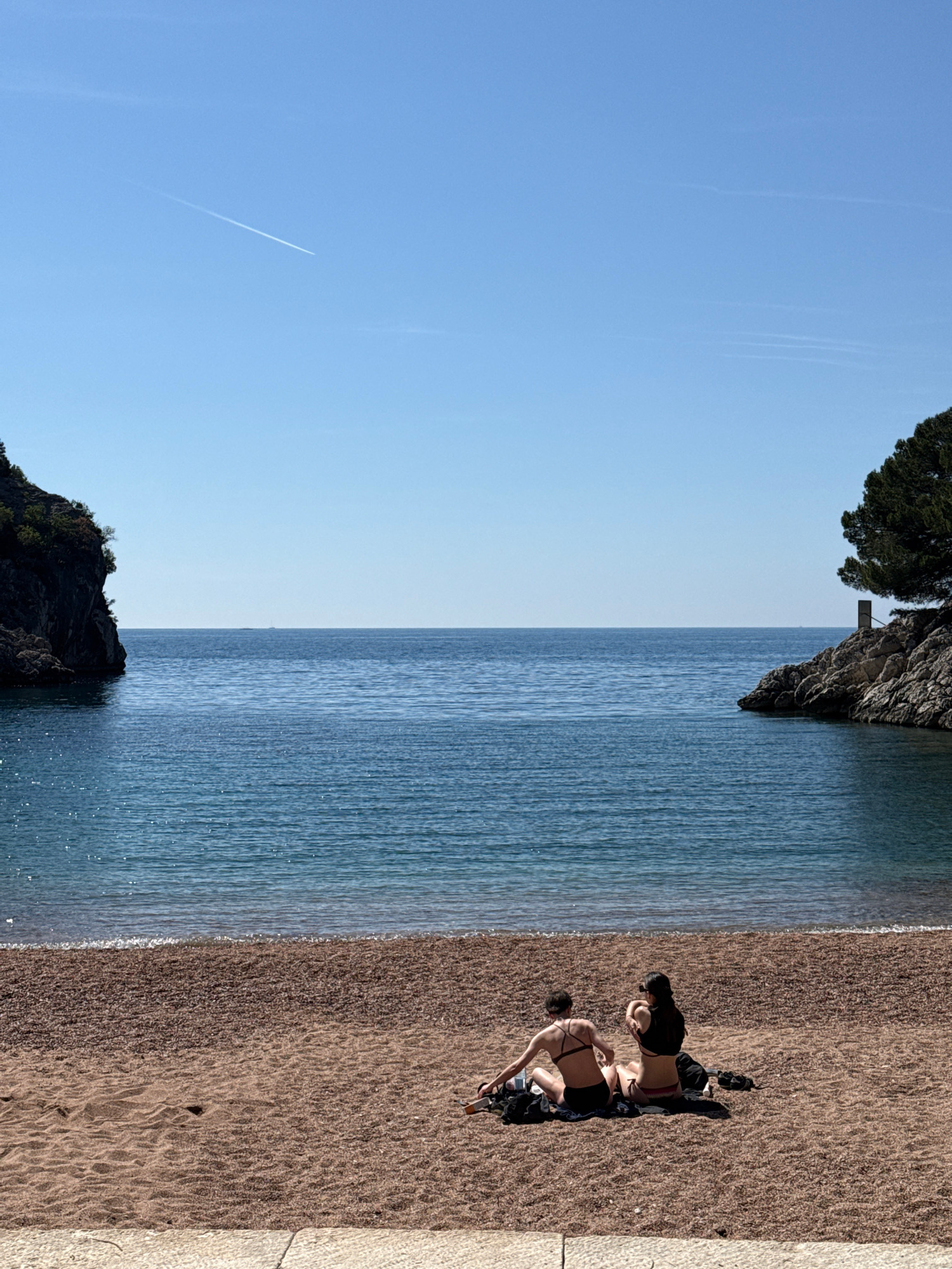 The image shows a beach scene in Pržno, Montenegro. The view is oriented with the beach to the right, the Adriatic Sea in the middle, and the sky to the left. Two people are on the beach near a wall.…read more