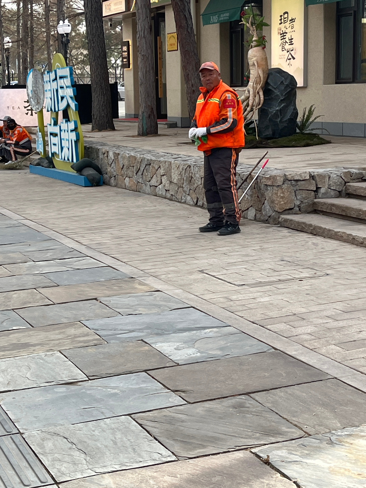 A street cleaner in Changchun City, China, is shown standing on a paved walkway. He is wearing an orange reflective vest, a pink cap, and dark trousers. He is holding a green rag in his gloved left ha…read more