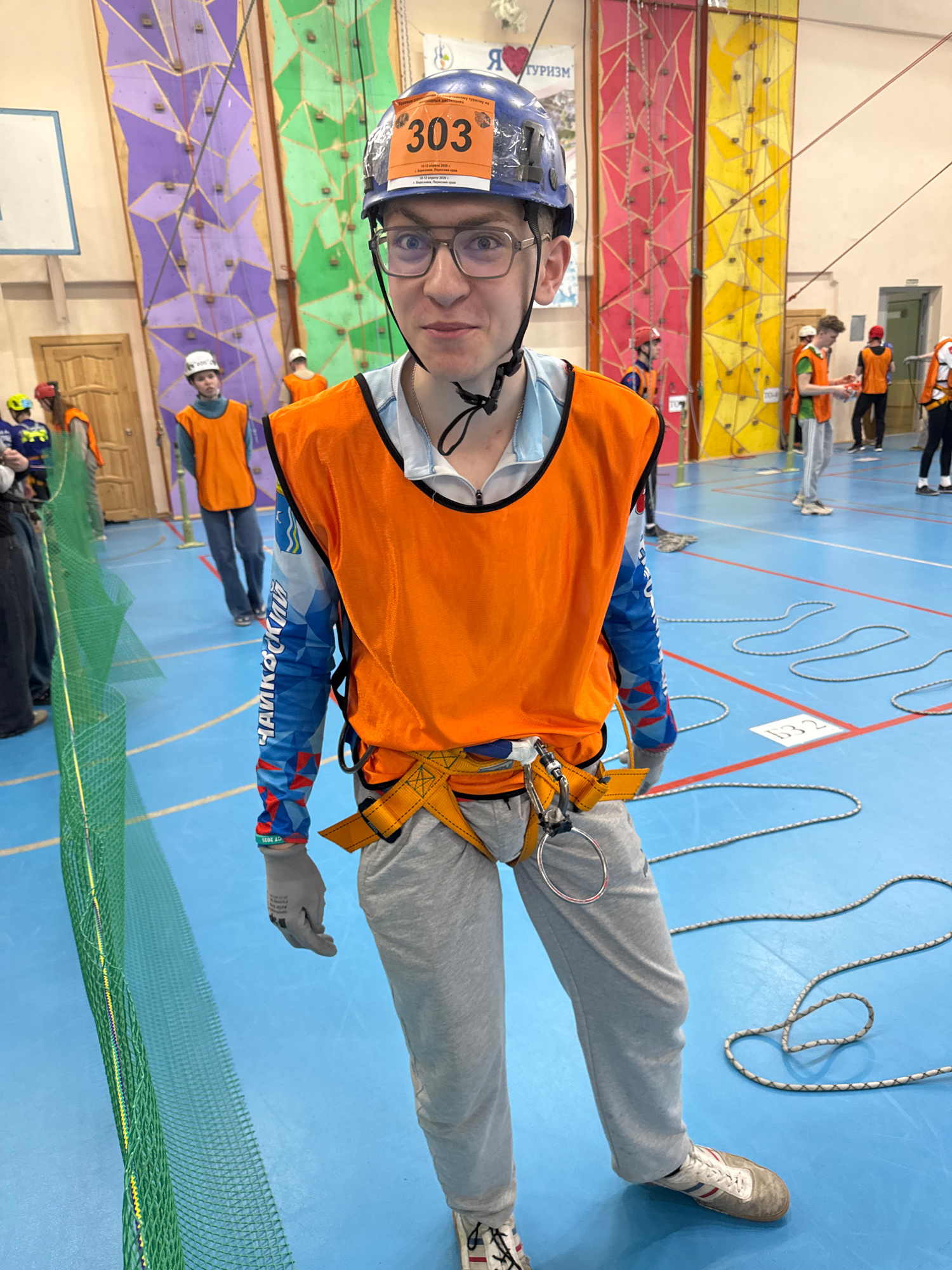 A young person wearing a climbing harness, an orange vest, and a helmet with the number "303" stands in a gymnasium in Berezniki, Russia. The person is wearing glasses, grey sweatpants, and athletic s…read more