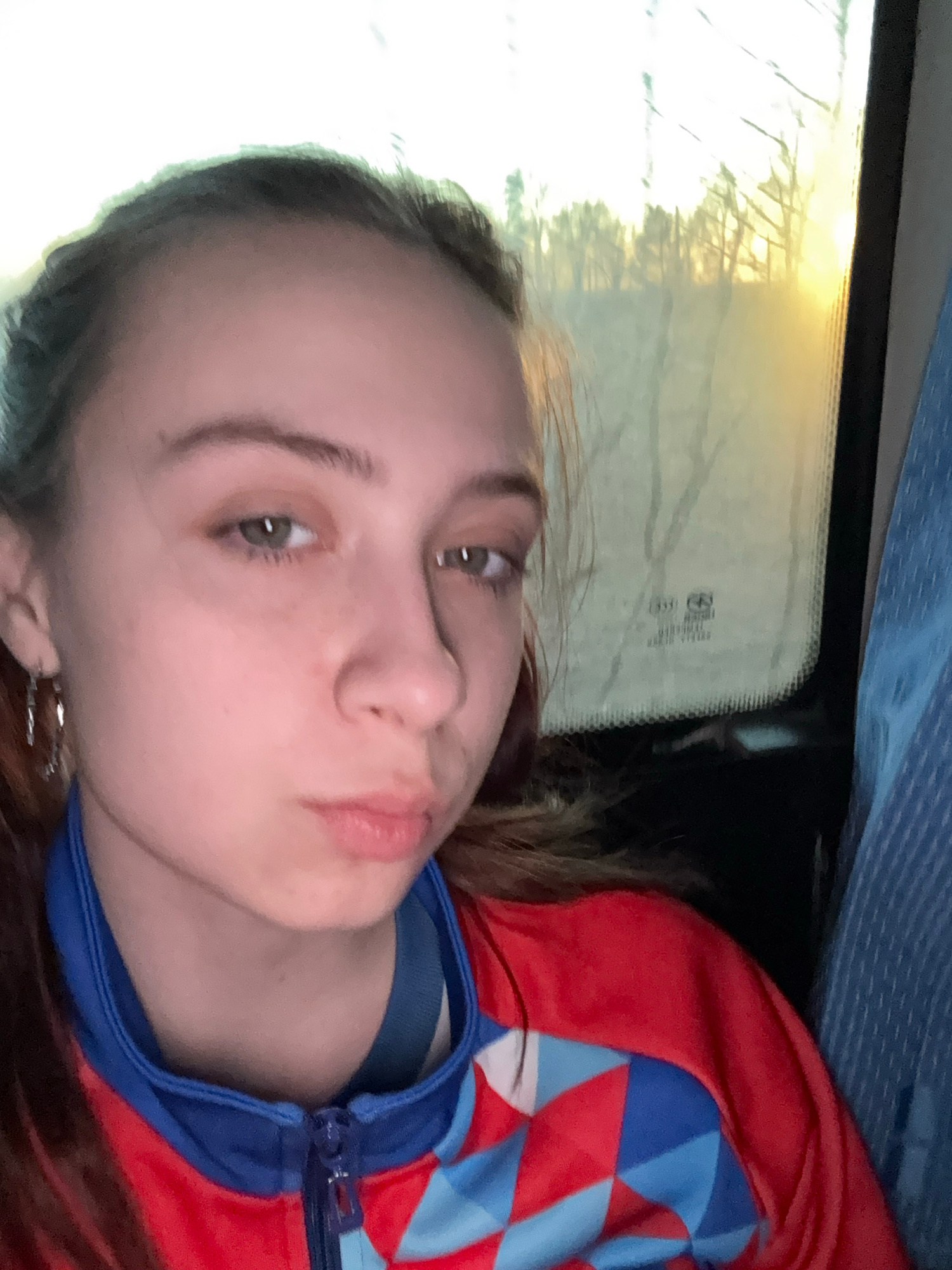 A young woman is taking a selfie, seemingly inside a vehicle. The light from the window suggests it may be dusk or dawn. The woman has fair skin, light-colored eyes, and is wearing a red and blue jack…read more