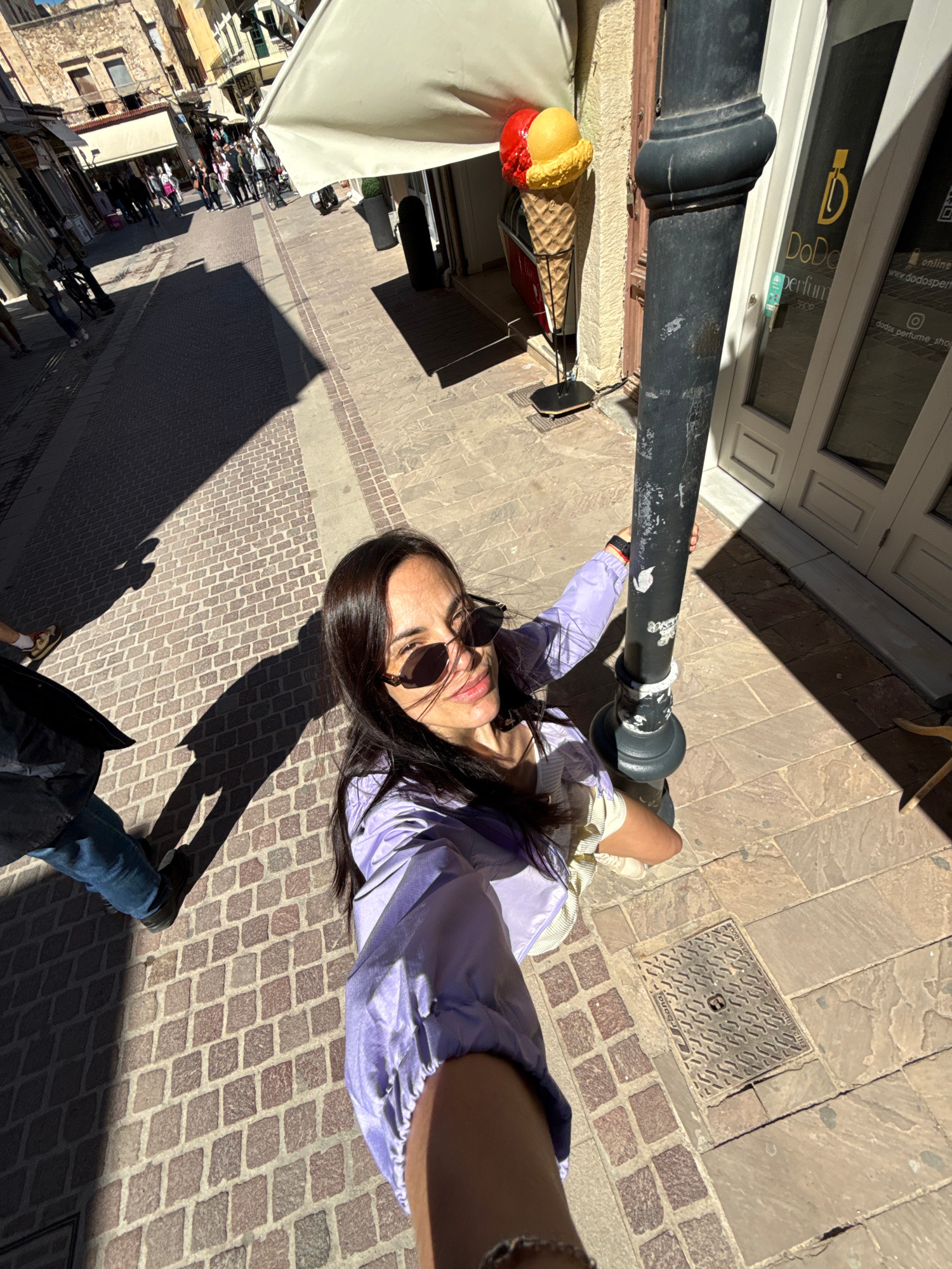 A person wearing sunglasses and a purple jacket leans against a street lamp post in the city of Chania, Greece. The photograph is taken from a high angle, looking down at the subject, the cobbled stre…read more