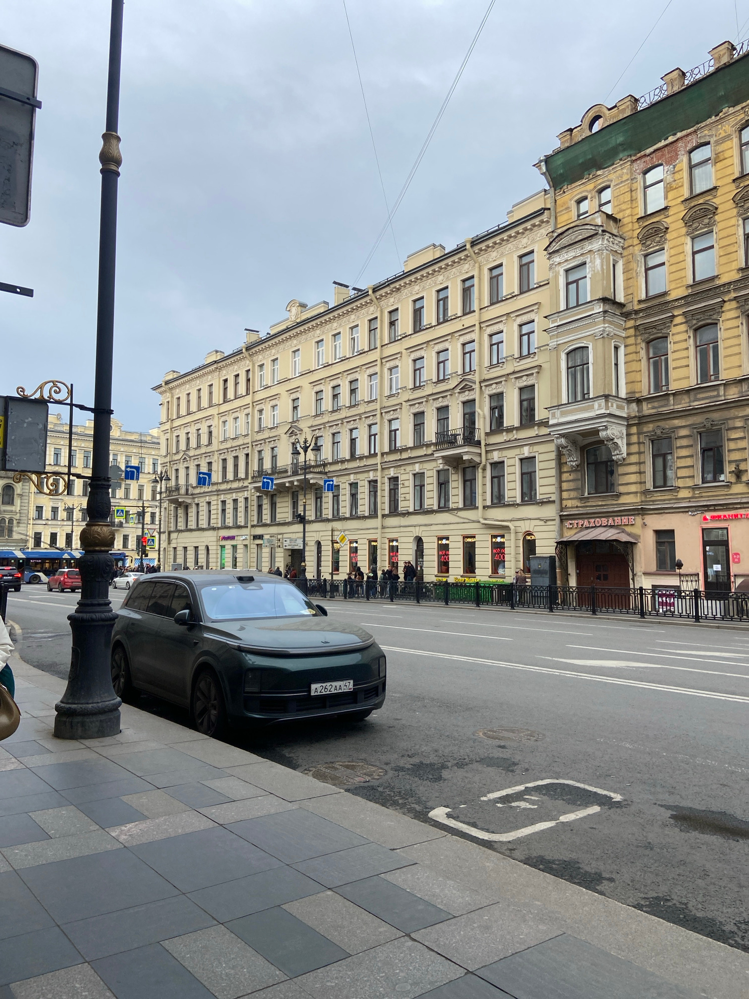The image captures a street scene in Saint Petersburg, Russia. A dark green car is parked on the sidewalk, its license plate visible. A street lamp with ornate detailing stands on the sidewalk. In the…read more